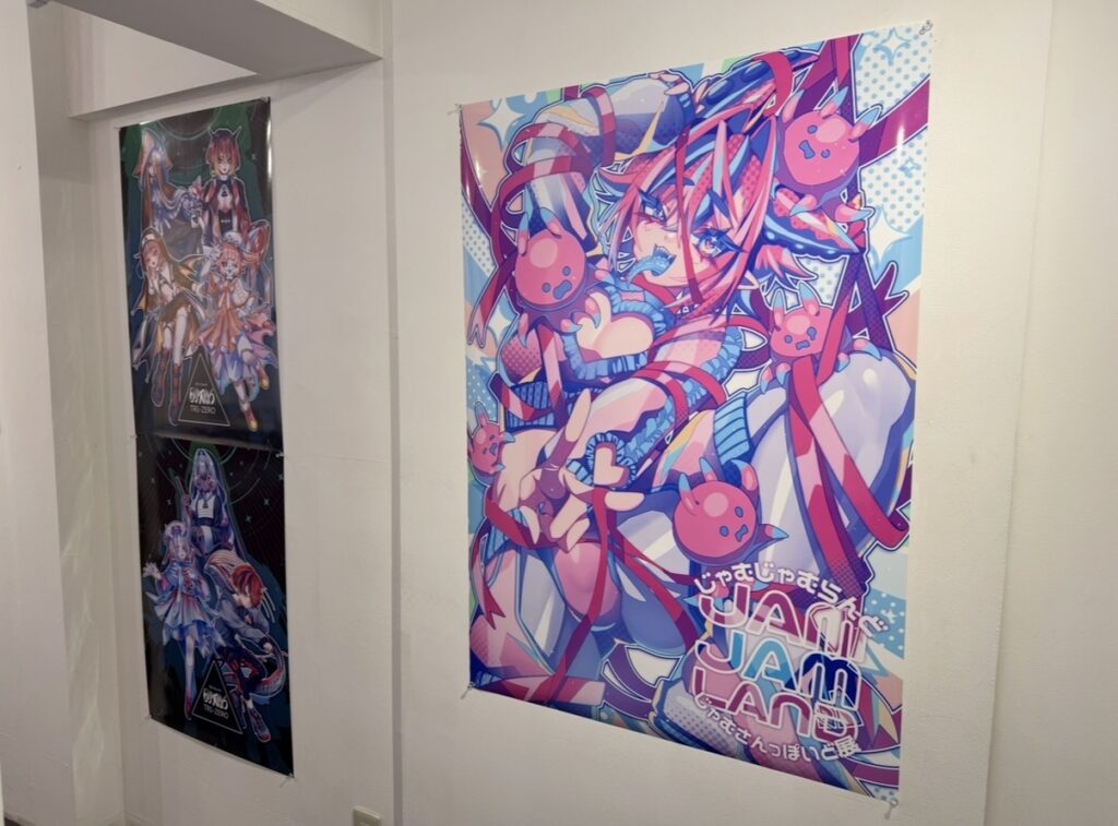 今回の展示では、じゃむさんっぽいどさんのオリジナルキャラクターのイラストが壁一面に展示されていたり、