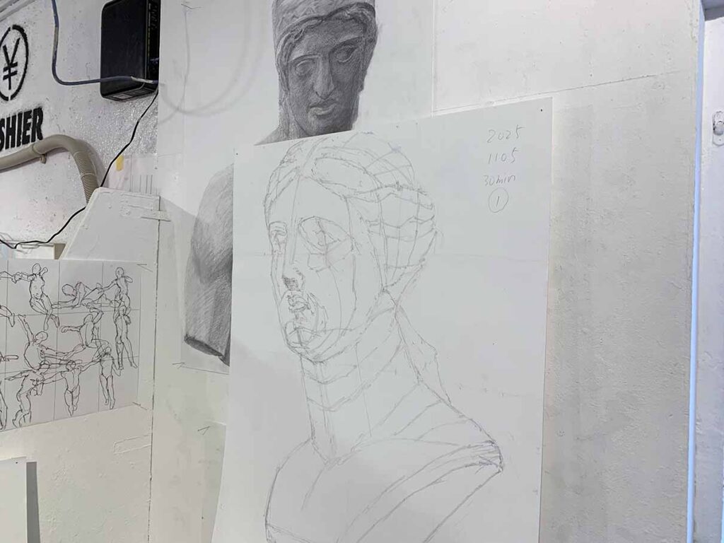 展示の主軸としては右から順にデッサンを観ていく構成になっており、デッサンの上達していく様をご覧いただけます。