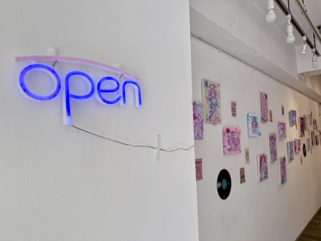 作品と共にレコードやヴィンテージ感のあるポストカードなどが作品と共に飾られていて、ダイナーの雰囲気が展示空間全体に広がっています💿✨