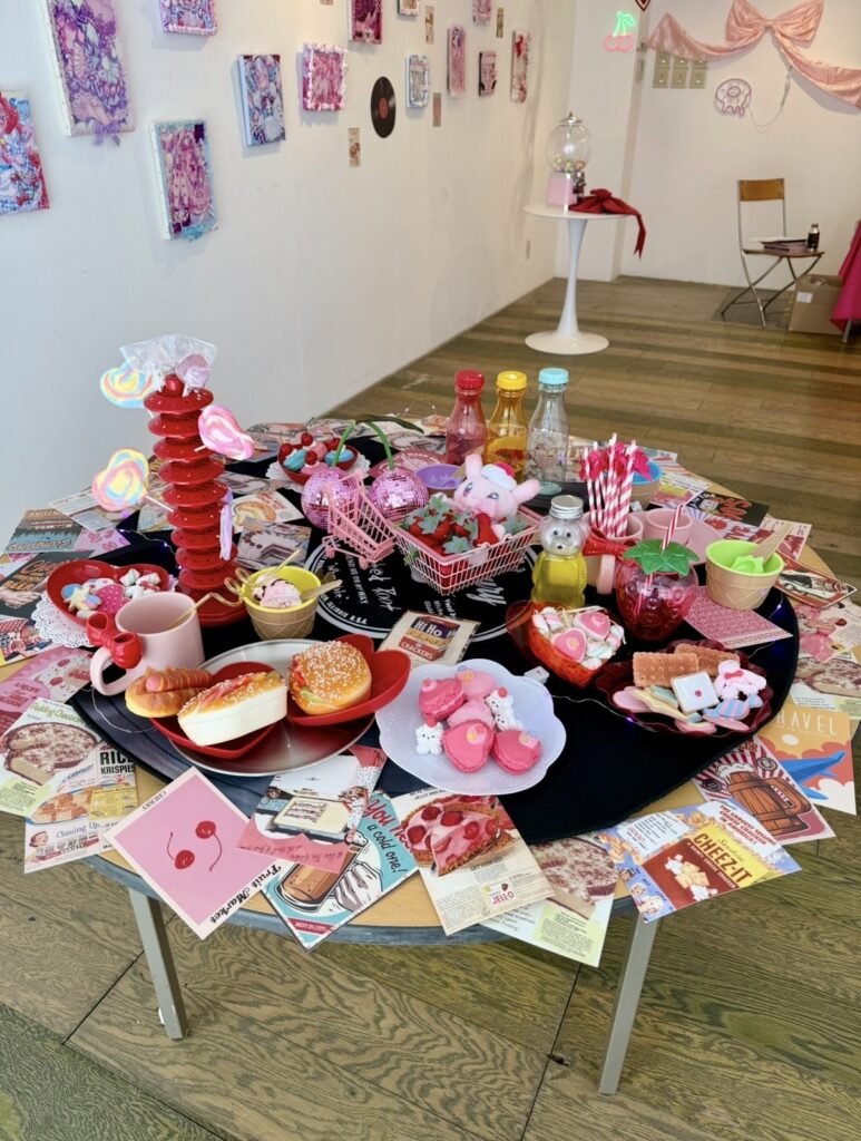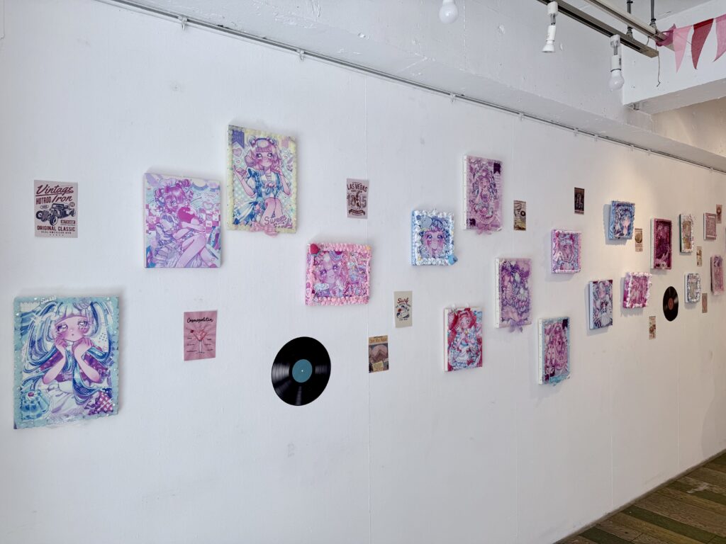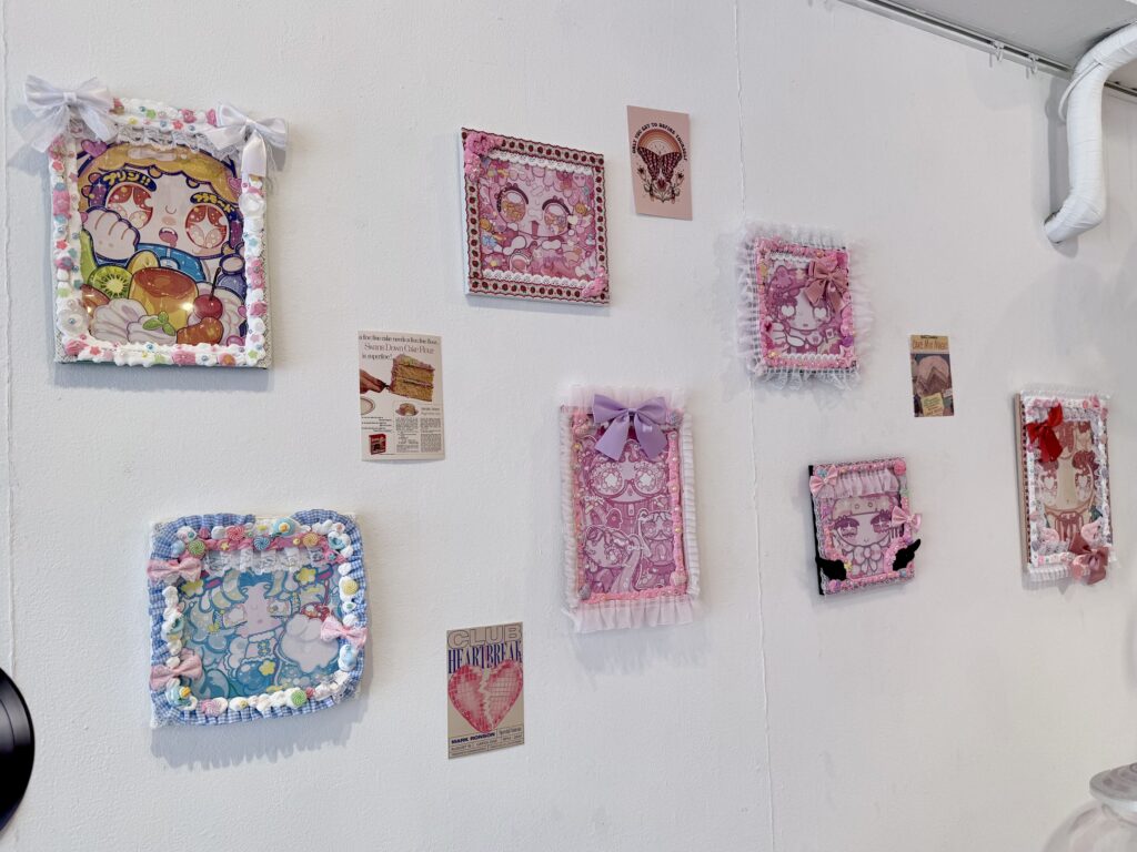 プリンアラモードやクリームソーダなどの美味しそうな食べ物と、お目目がキラキラな女の子が描かれた、ポップでカワイイ作品が並びます💖