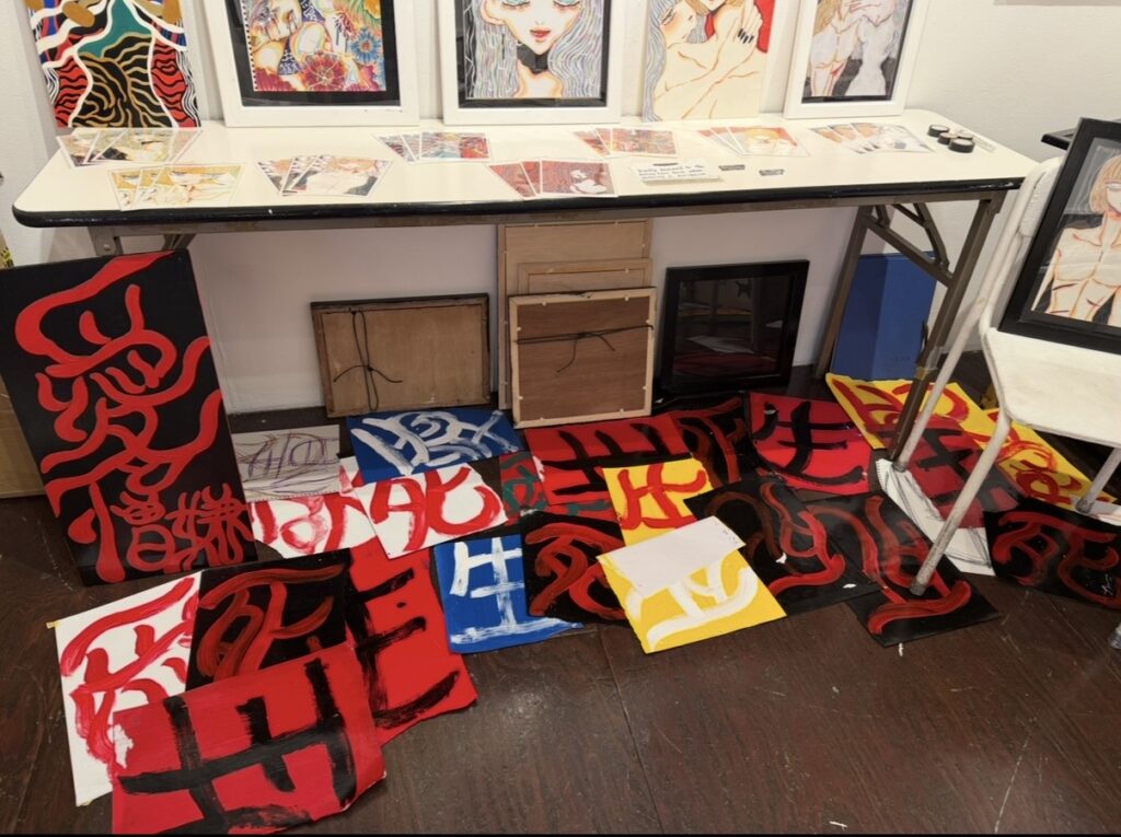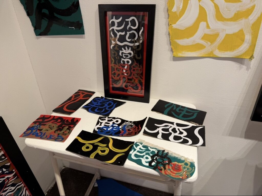床には「生」「死」「愛」などといった文字が描かれた作品が広がっています!
