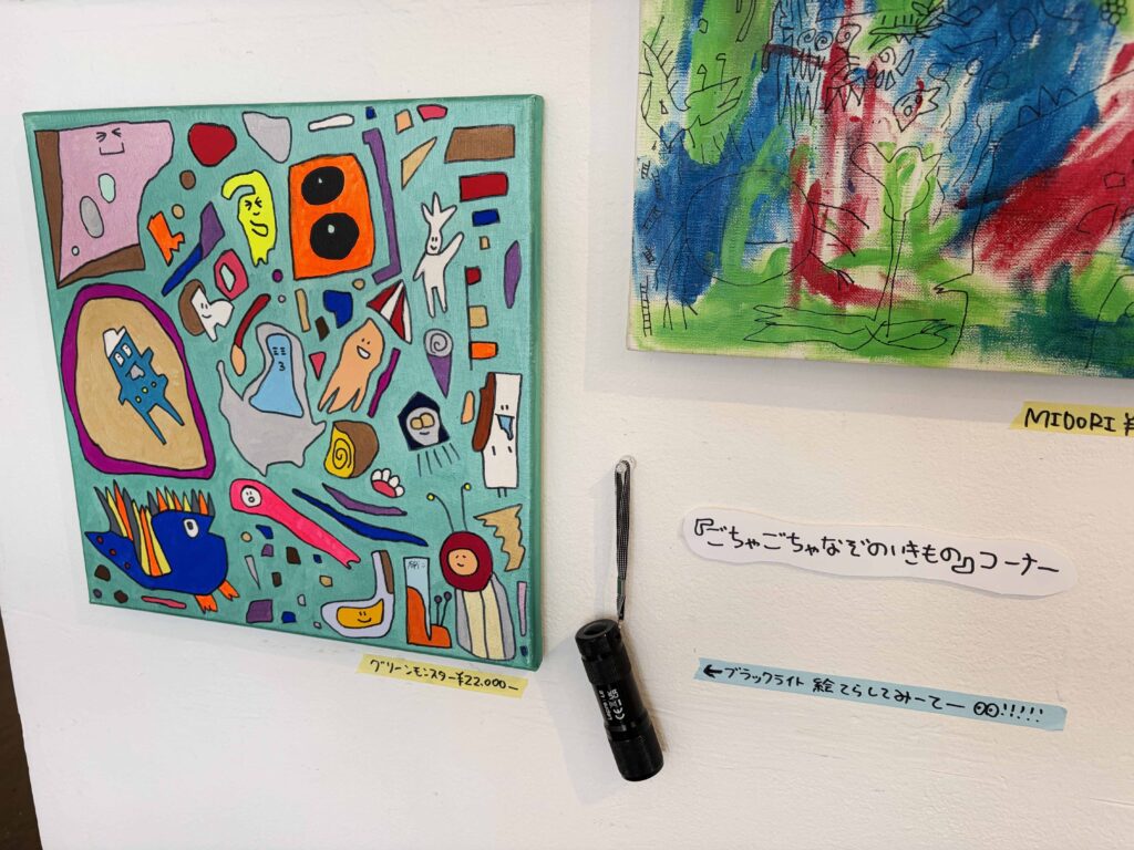 作品の隣にブラックライトが用意されて、絵に照らしてみると、何かが見えてくるかもしれません!