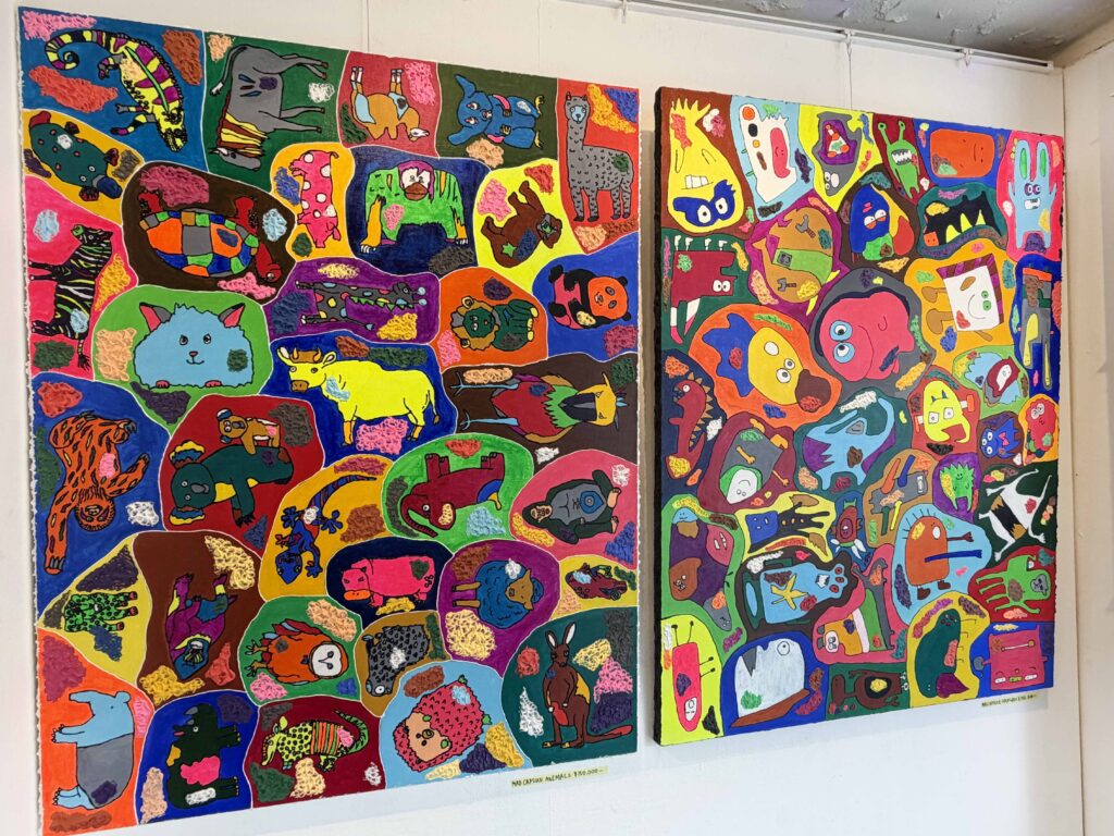 色の使い方や線の引き方なども特徴的で、蛍光色が多く使われており、作品を見るとテンションも上がってきます✨