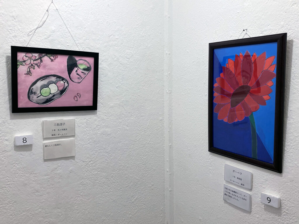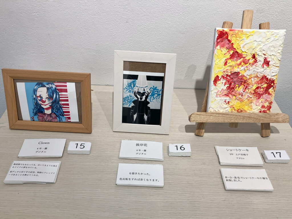 学生さんそれぞれが選んだ3色を主に用いて制作された作品たちが並びます✨