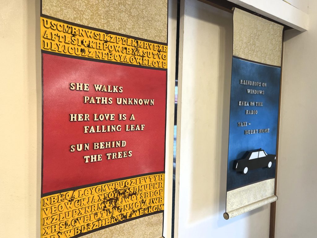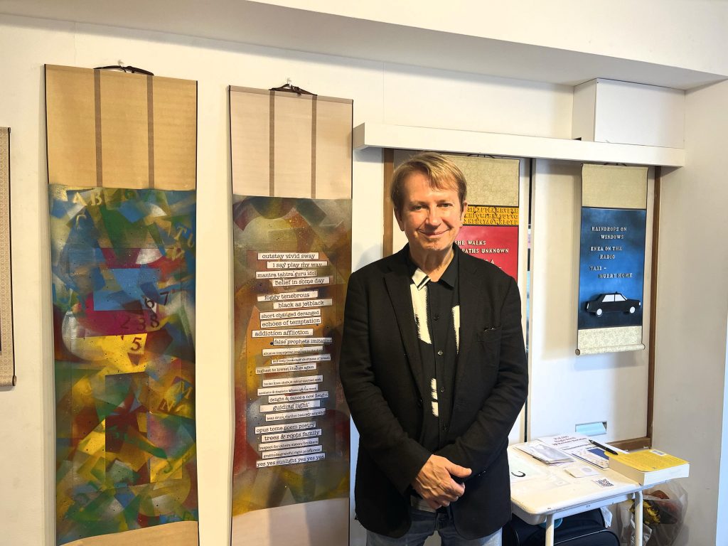 重ねている形状、カラフルな色合い、英語の文字などが掛け軸に表現され、一般的な掛け軸とかなり違う印象が与えてくれます!