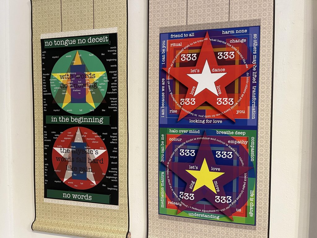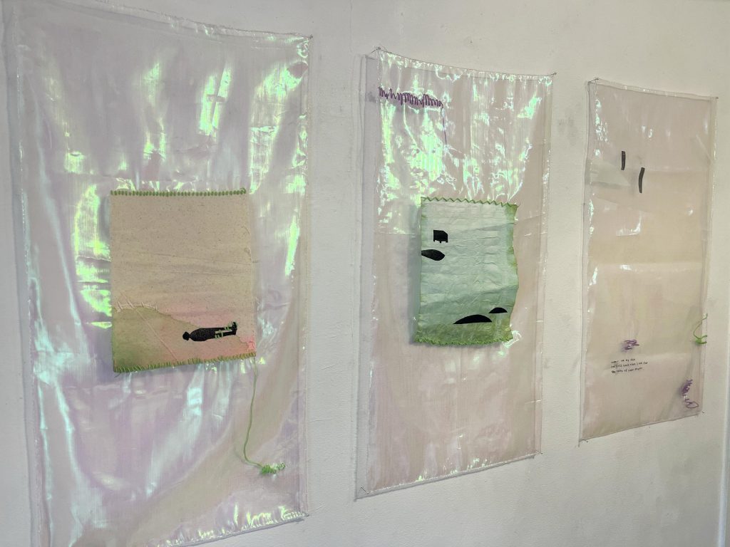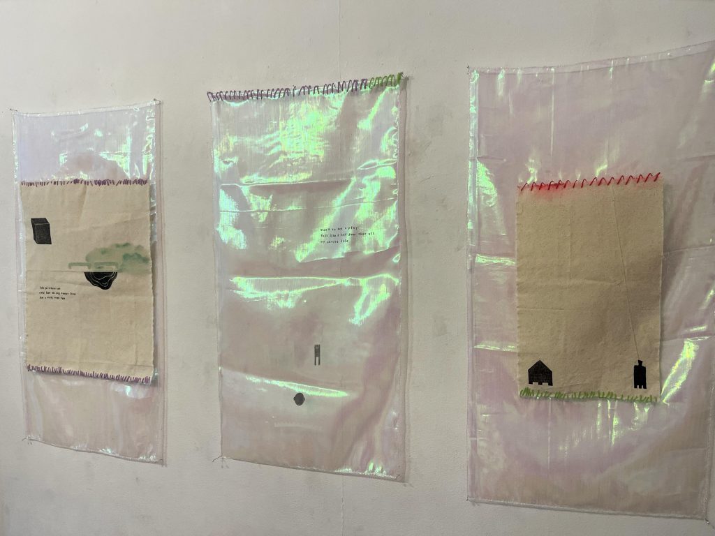 壁にかけたり、天井から吊り下げたり、窓際にかけたりする形で表現される展示になります。
