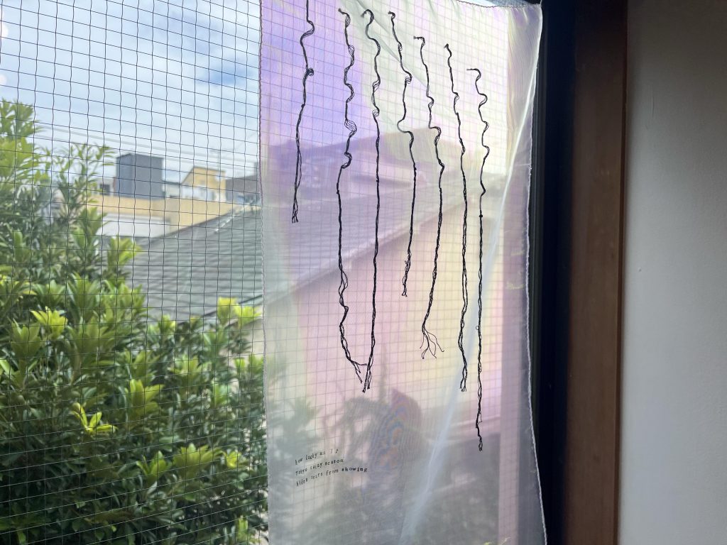 艶々して、角度による違う輝きを放つ絹に、糸と紙をその上に縫い合わせ制作されました。