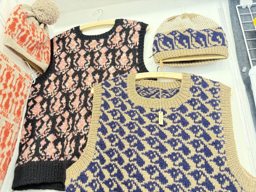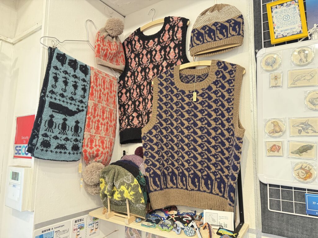 また、一見柄のように見えますが、よく見ると実はイカやペンギンが描かれている、ユニークなニットも必見です👀🦑