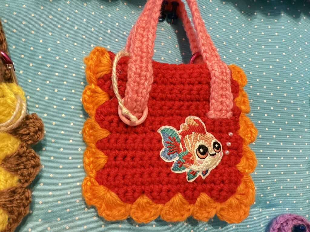 ミニミニかぎ針編みトートバッグチャームの展示と販売が行われています。