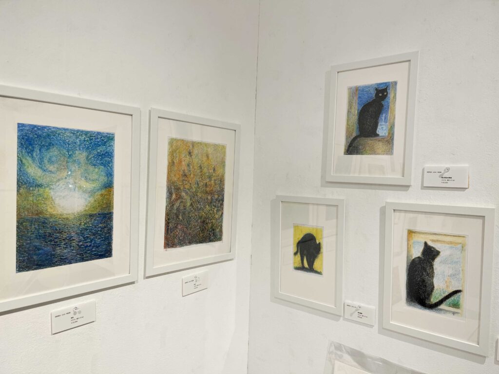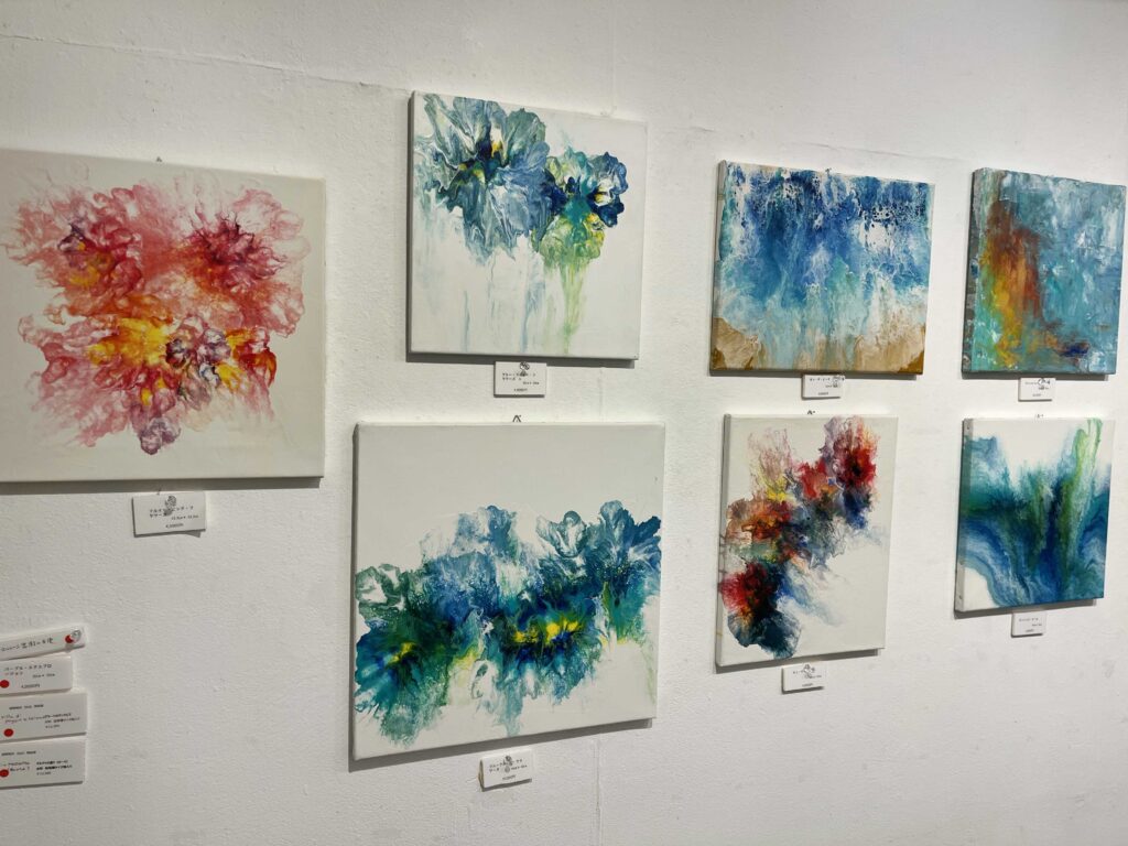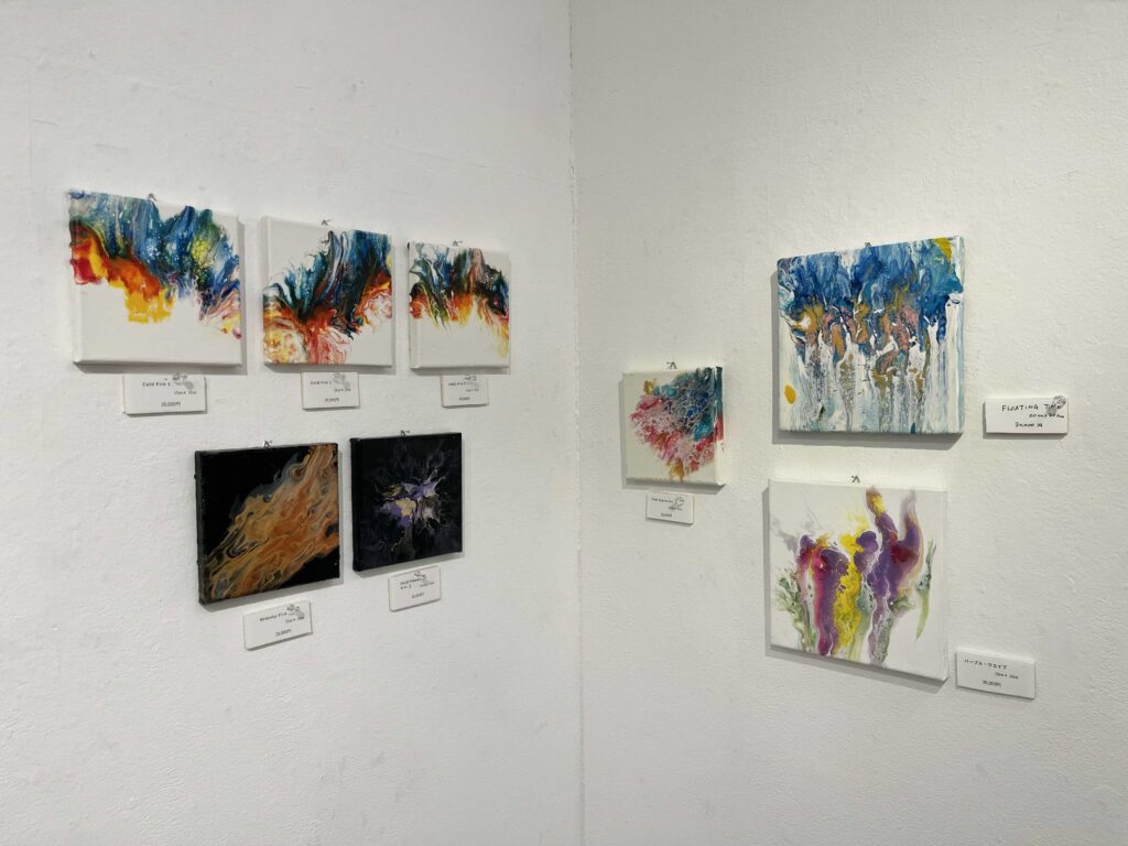 今回の個展で展示されている作品はイタリアで制作されたフルイドアートや街の景色、猫の絵画作品になります!