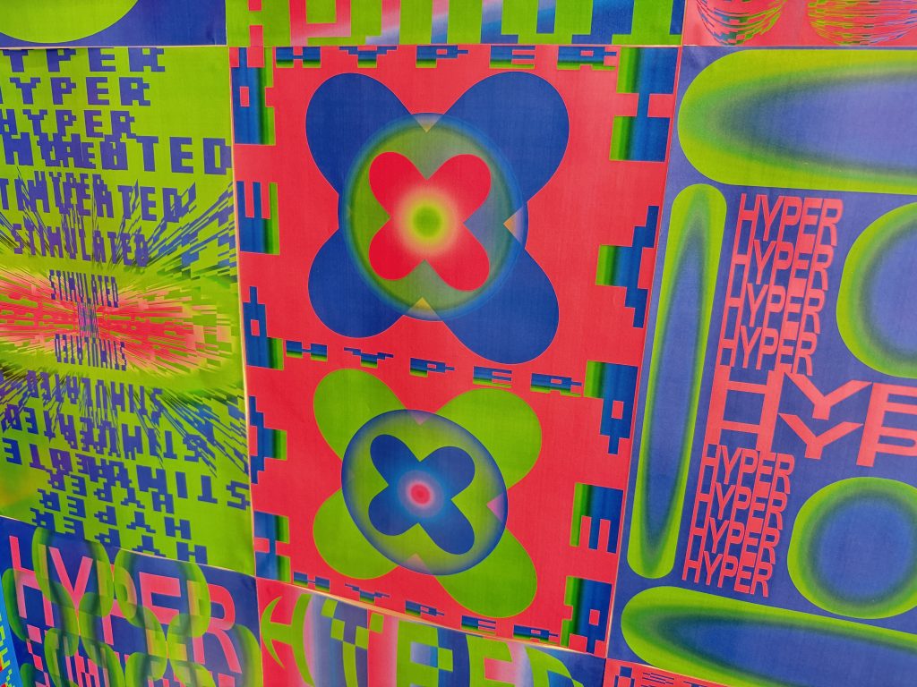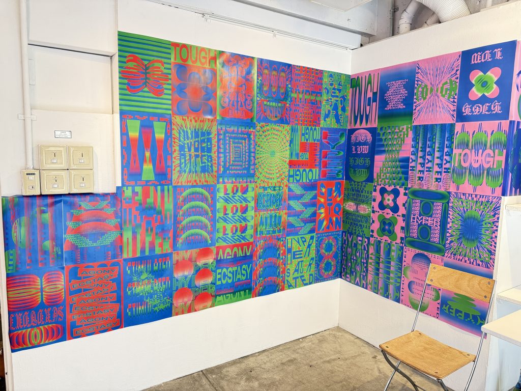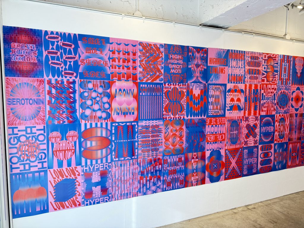 幾何学的な図形とテキスト、そして色が組み合わさった作品たち。
