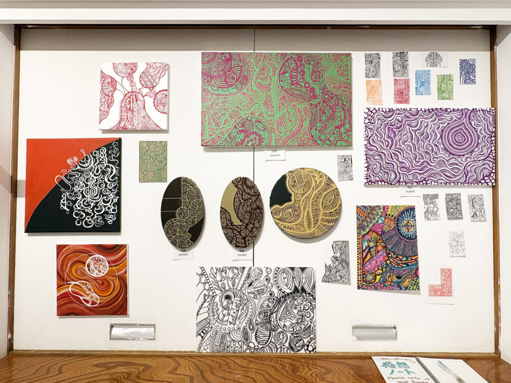 中学生の頃から現在に至るまで、知加さんが描かれた様々な作品が壁面いっぱいに彩ります。