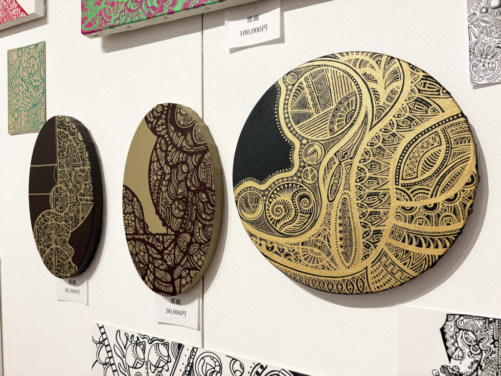 中学生の頃から現在に至るまで、知加さんが描かれた様々な作品が壁面いっぱいに彩ります。