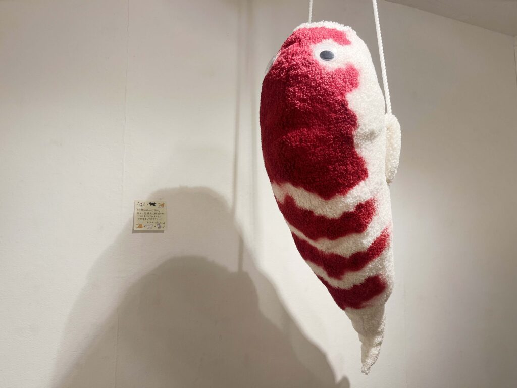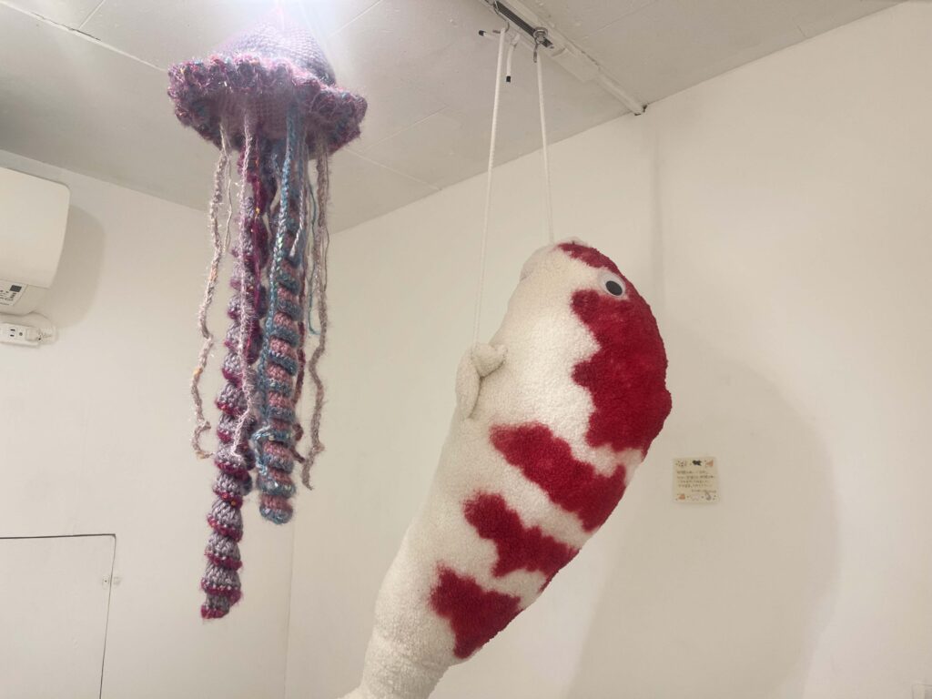 編み物で作られたクラゲ、鯉のぬいぐるみ。