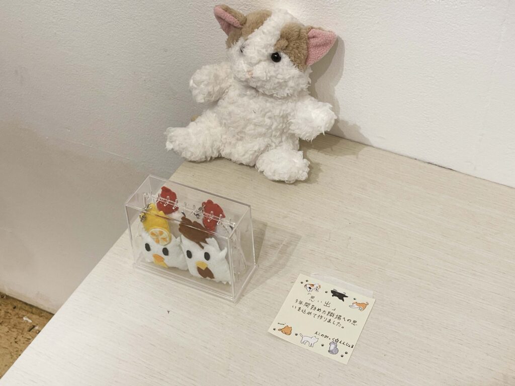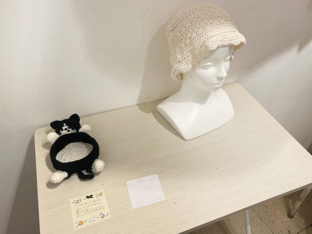 ハチワレのデザインの小物入れや可愛い帽子も部員たちが手作りで編んだ作品。