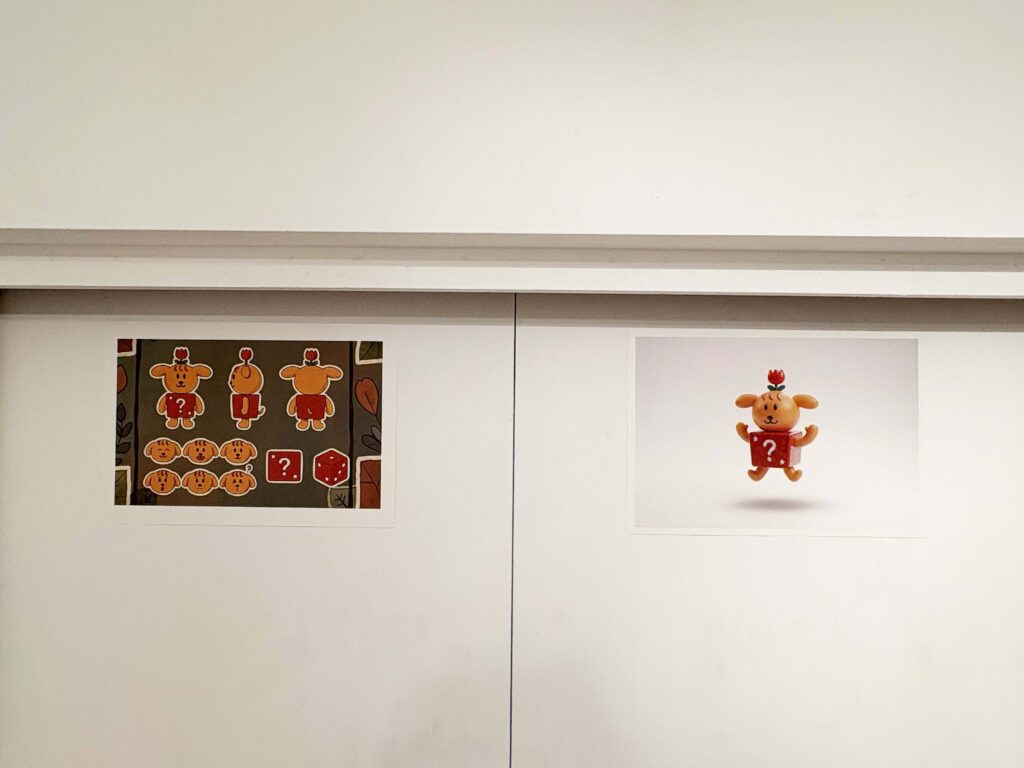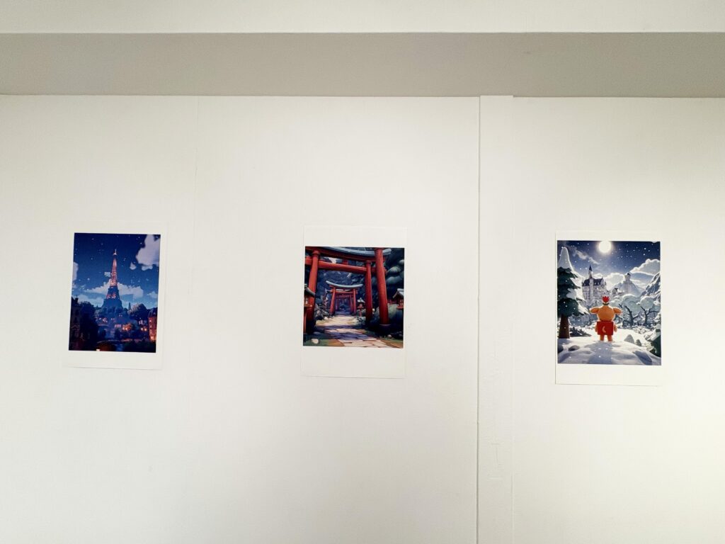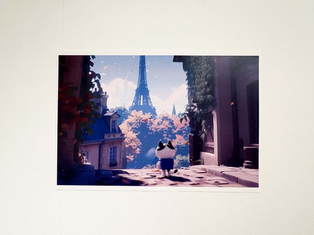 本展示では、プレイヤーとなる猫と犬のキャラクターのイメージや、実際に3D空間に移動したイラストを展示されています。