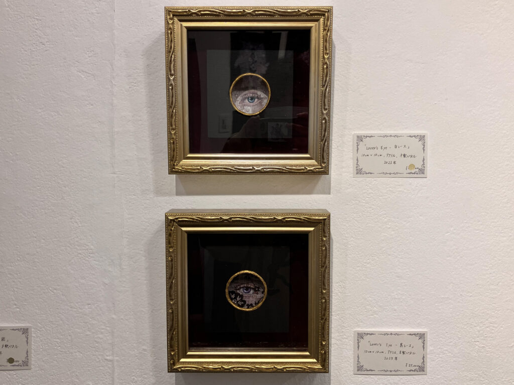 こちらの穴の空いた絵画シリーズはシンプルな一色の背景に、金縁の丸い穴さらにその中には繊細で緻密な目元や蝶が描かれています。