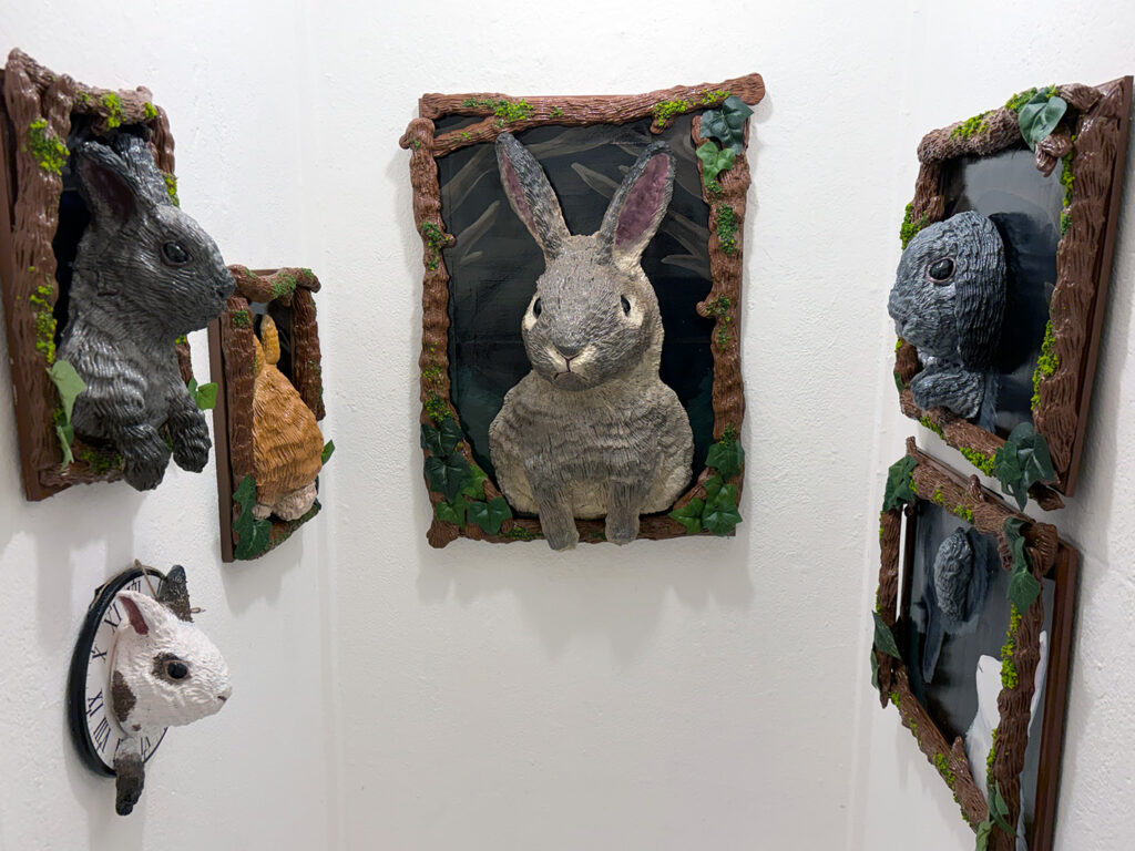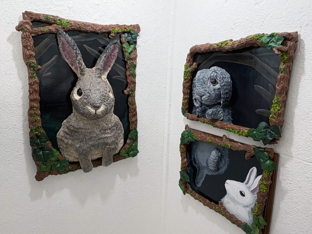 森の中のようなデザインの額縁から顔を覗かせる様々なうさぎたちは、まるで生きているかのように生き生きとしています。