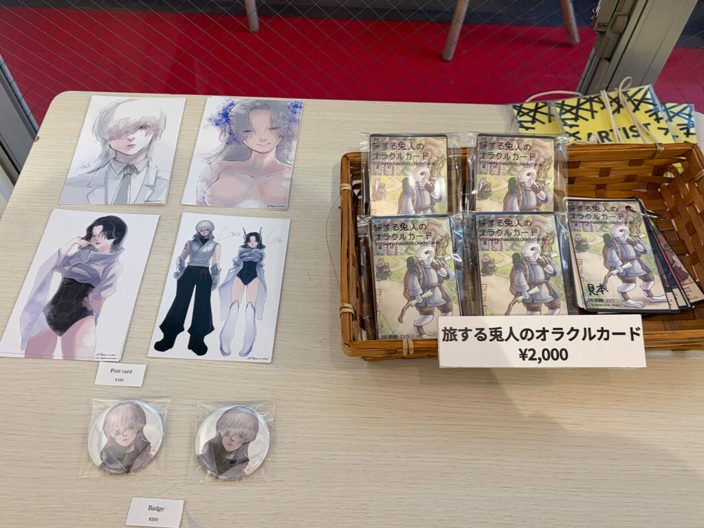 夜限の後にさんはキャラクターのポストカードと缶バッジのグッズ販売も行っています!