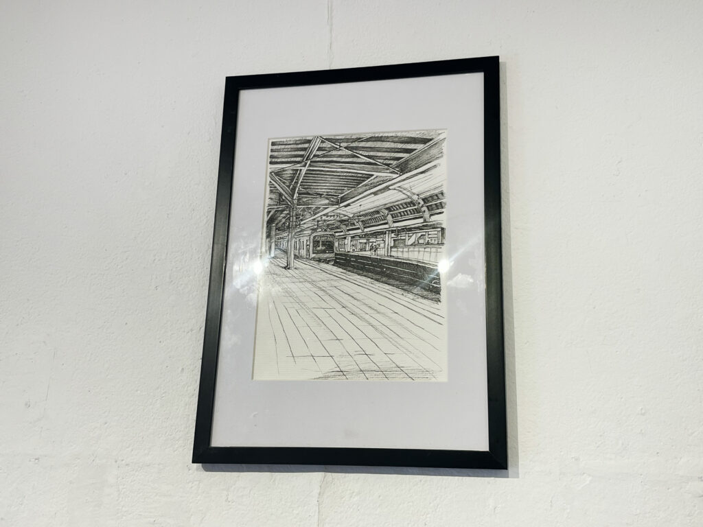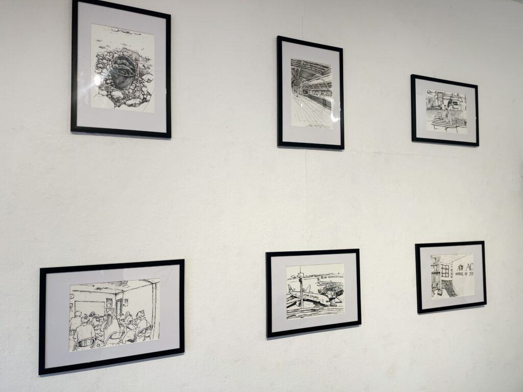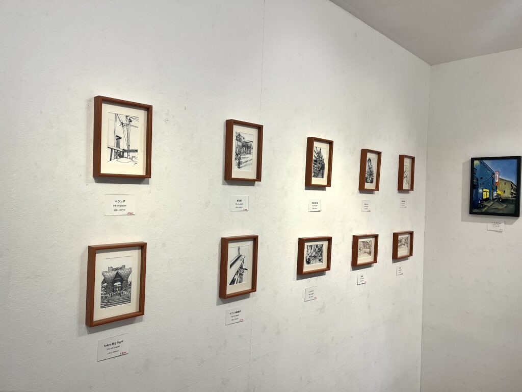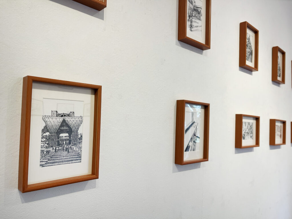 一枚一枚の額入りの線画作品が壁にずらりと並びます。