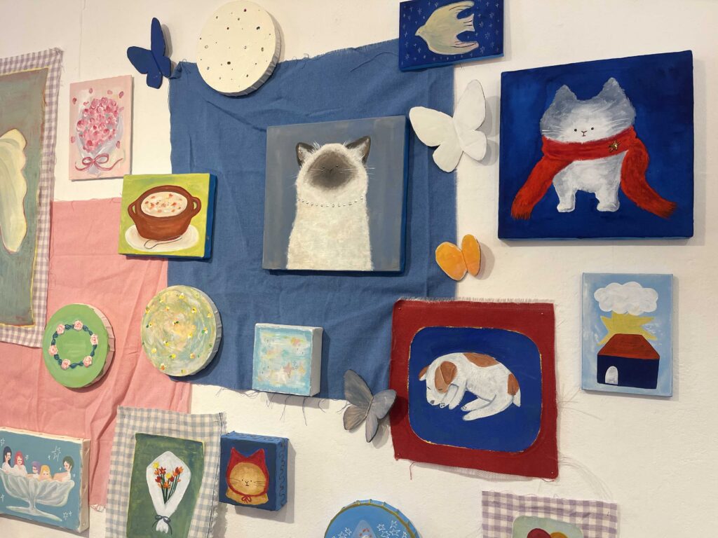 タイトルに沿って、暖かさを感じられる新作が展示されており、マフラーを巻いている猫ちゃん、温かいスープなど。