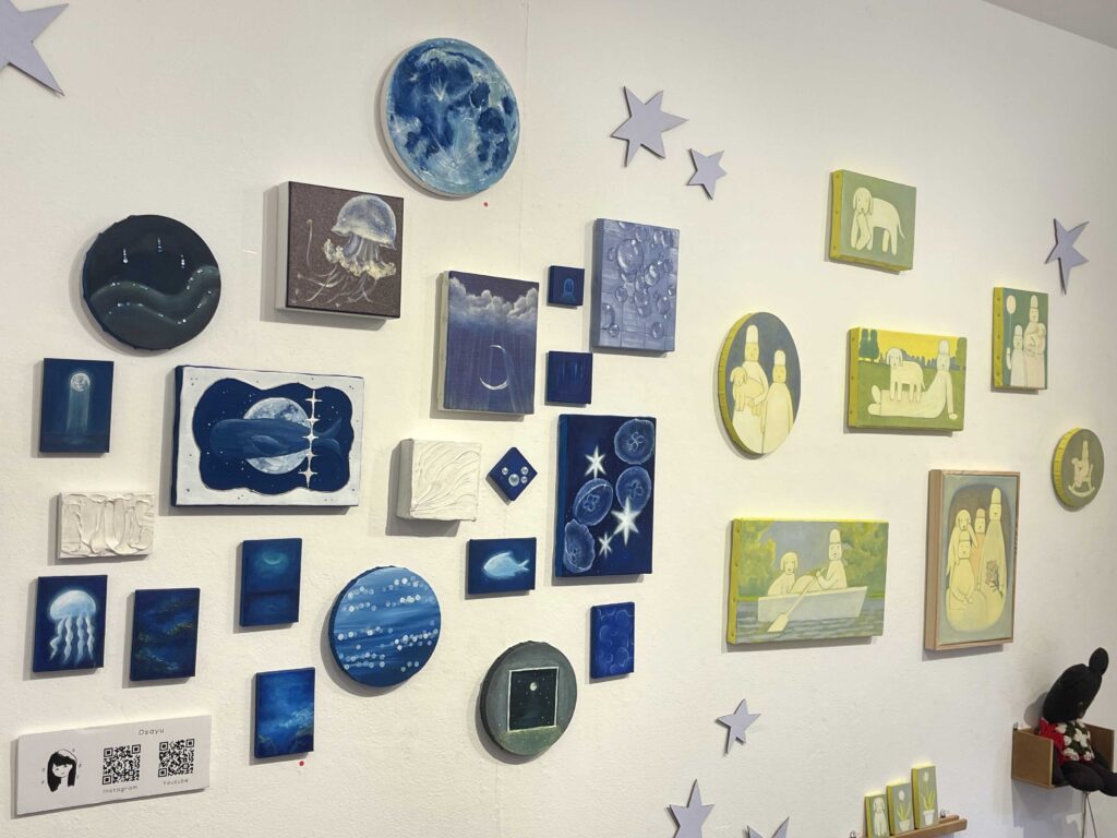 スペースに入ると、まず目に止まるのが壁に並んだ青色と黄色。お二人の色をベースに描かれた作品に惹かれました。