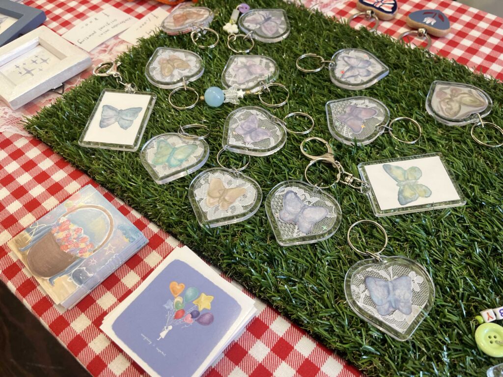 こちらのアクリルキーホルダーは原画作品が入ってあり、ビーズも付いています!