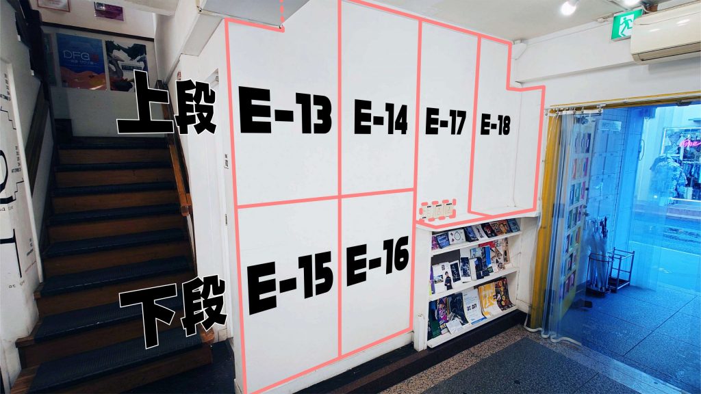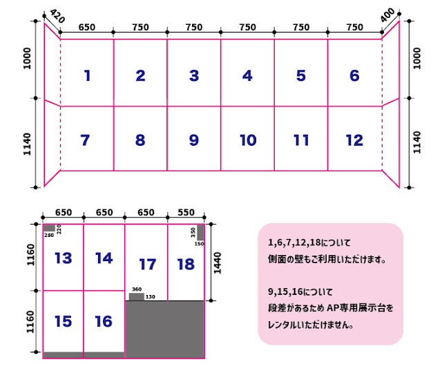 展示スペース上段(1,2,3,4,5,6,13,14,17,18)の出展者様は10時から搬入可能。
