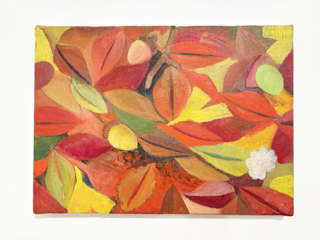 作品に近づいて眺めると、絵の具が盛り上がり、画面に凹凸があることに気づきます。植物の入れ方で画面に華やかさが増し、季節や時間が穏やかに流れているようです。