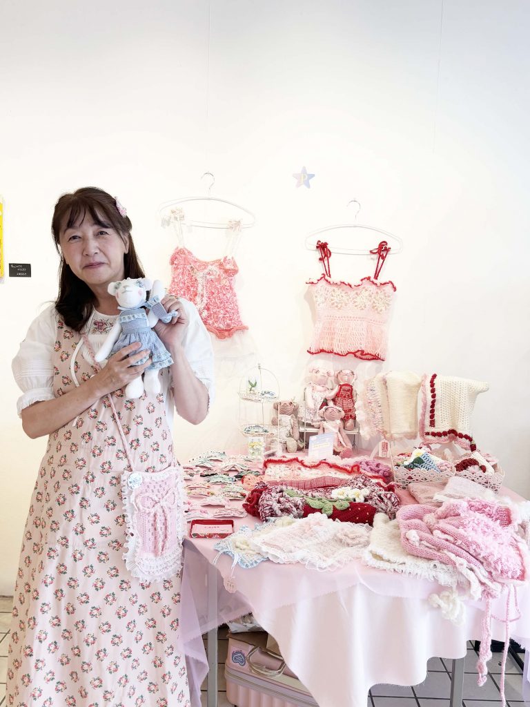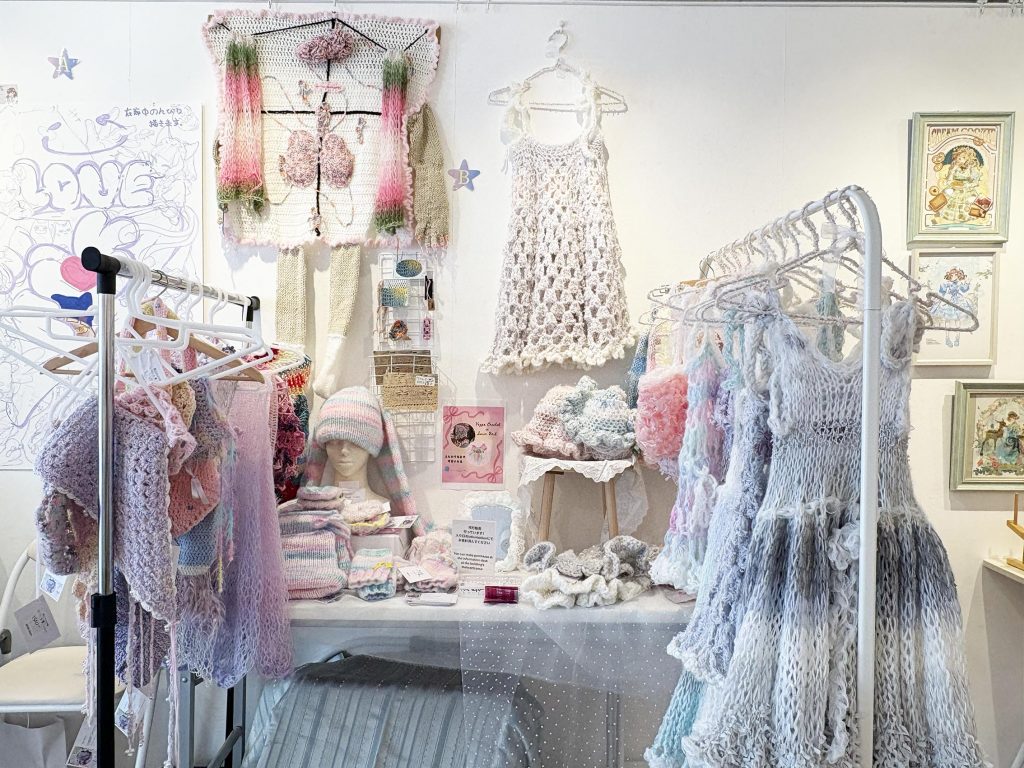 テーブルいっぱいに並べられたアイテムの数々は、編み物のあたたかみに加えて、レースを組み合わせたり、原宿らしいカラフルなパーツを取り入れたり、たまくるるさんならではの世界観があって、見ているだけで心がときめきます。