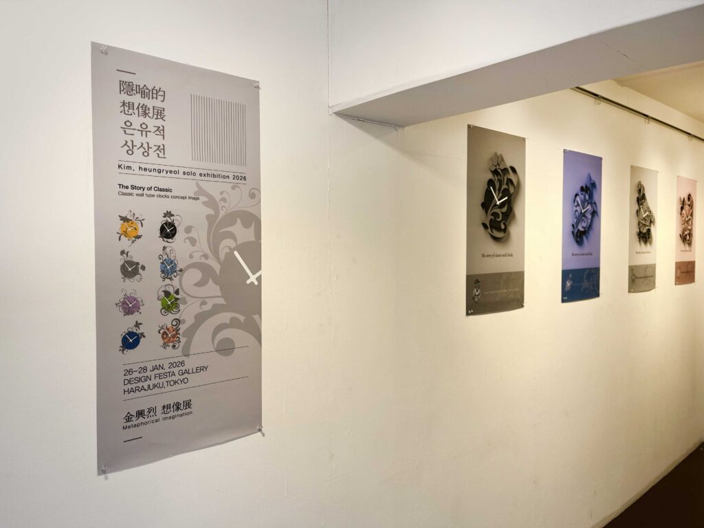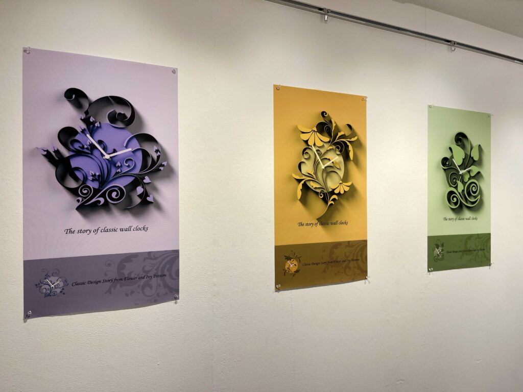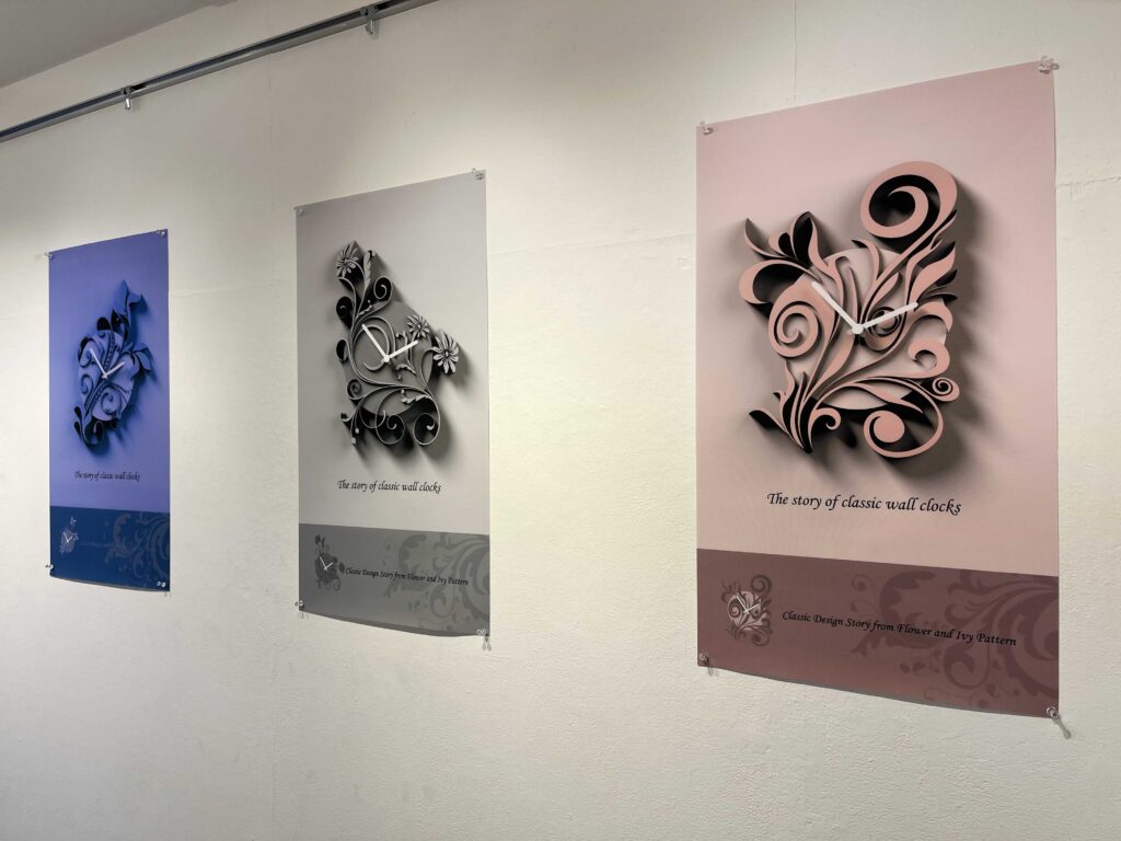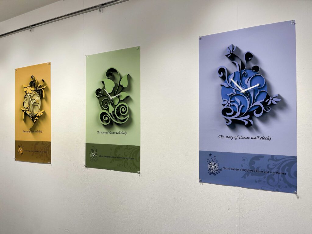 想像力を用いて作られた壁掛け時計のデザインのポスターが展示されています。