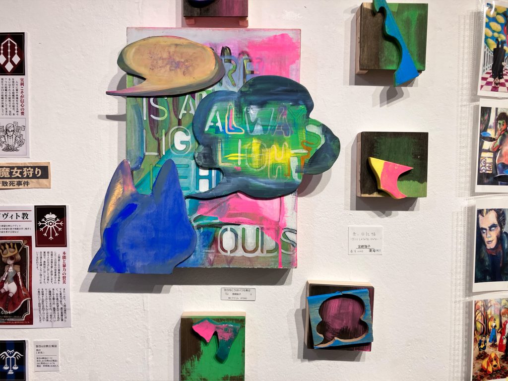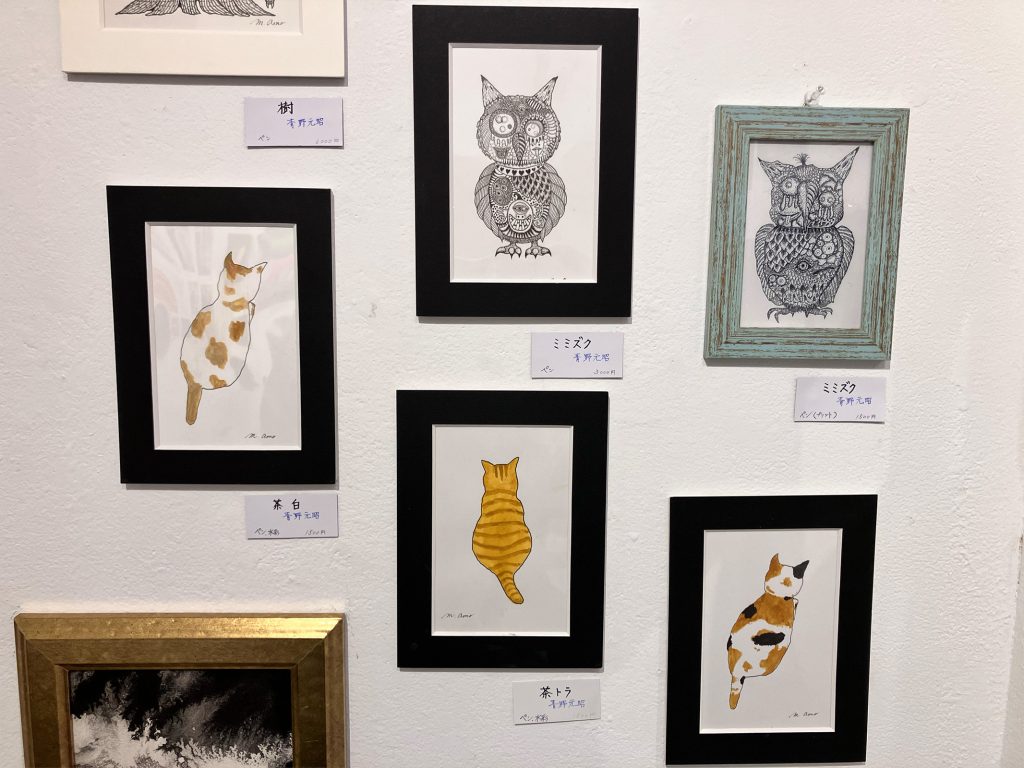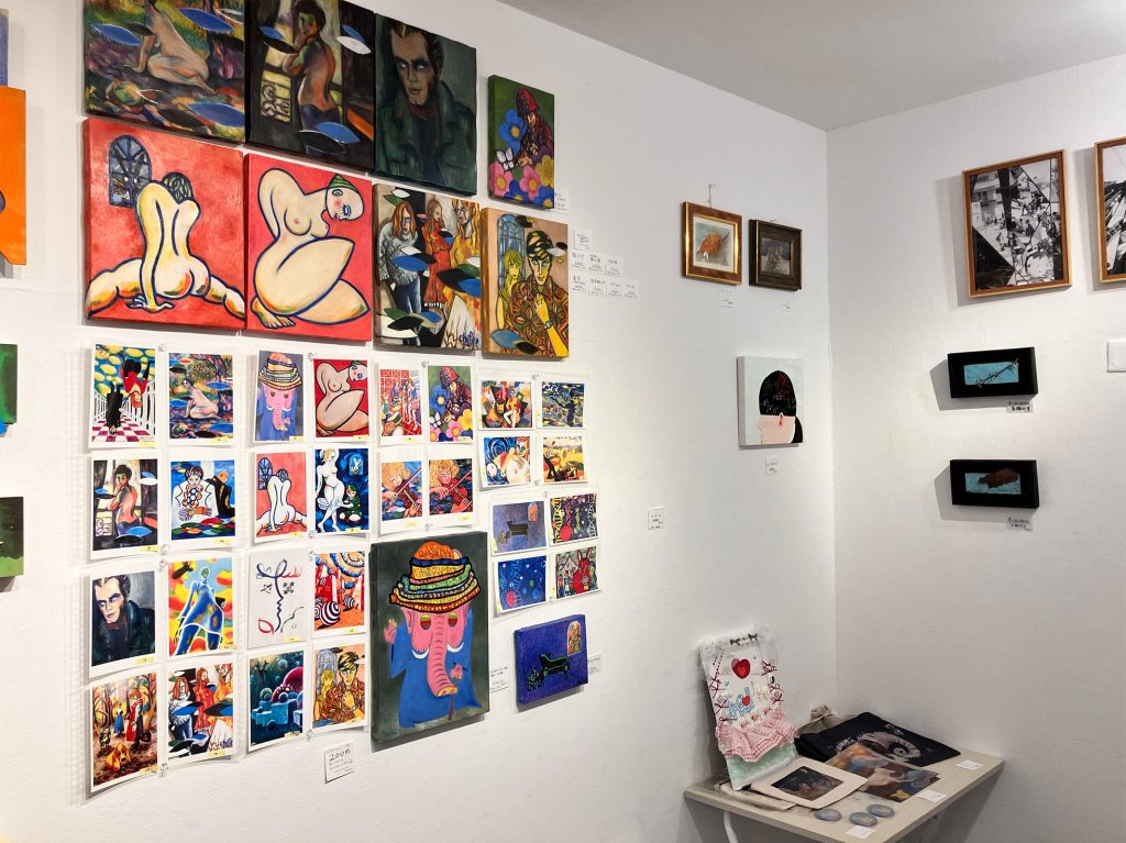 ペンや水彩を使用して描かれた小さなサイズのイラスト作品や、アクリル・墨・胡粉などウィ使用して描かれた絵画作品まで幅広いジャンルの作品が多数並びます✨