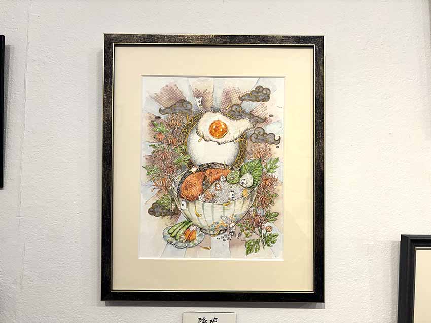 水彩とペンを交互に描き重ねていくことで食べ物の質感や繊細さを細かく表現されております。