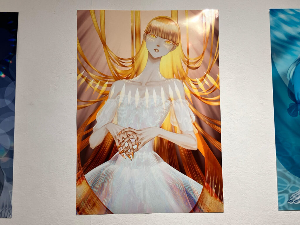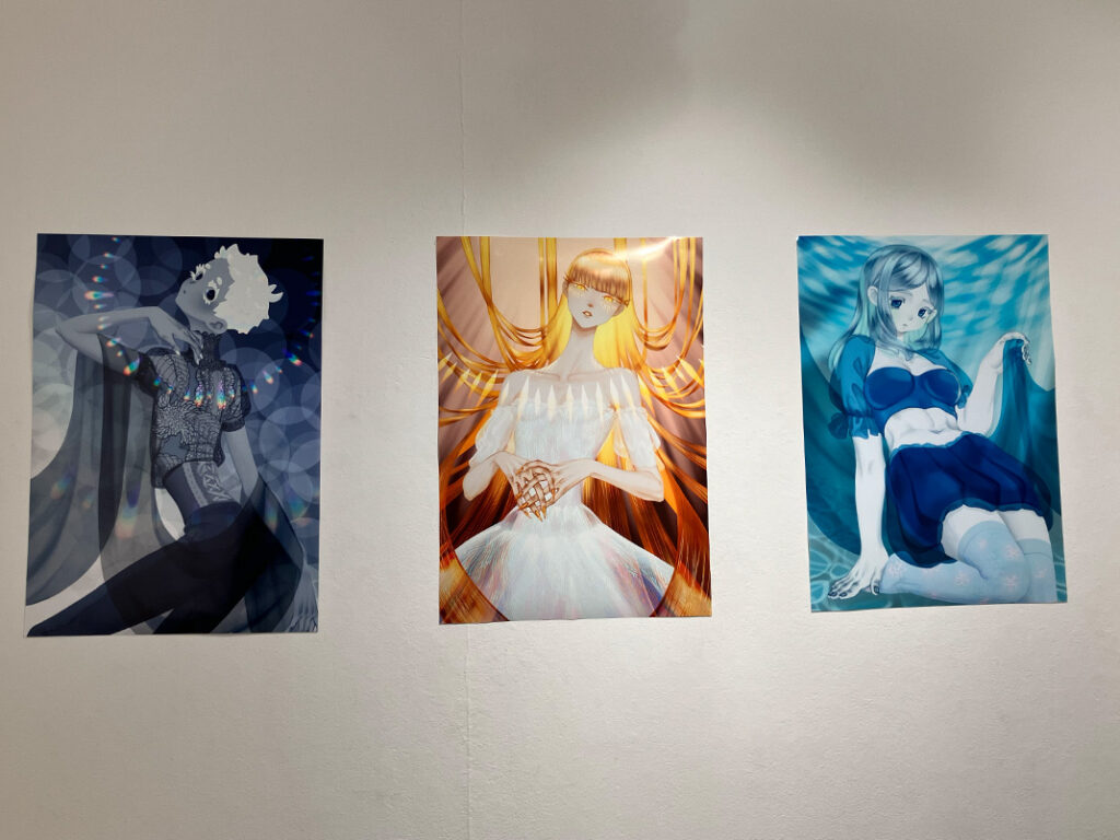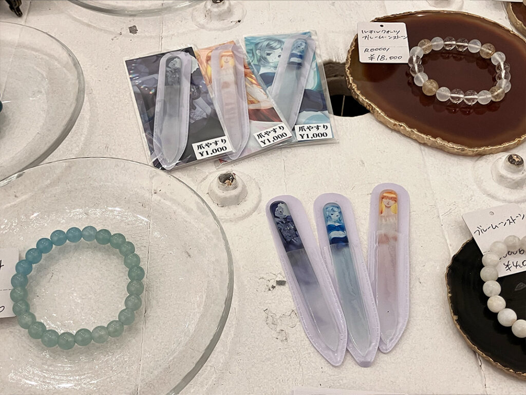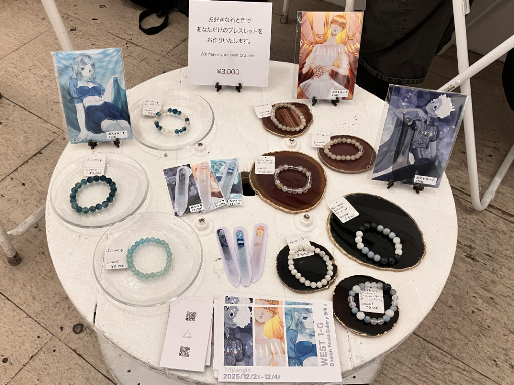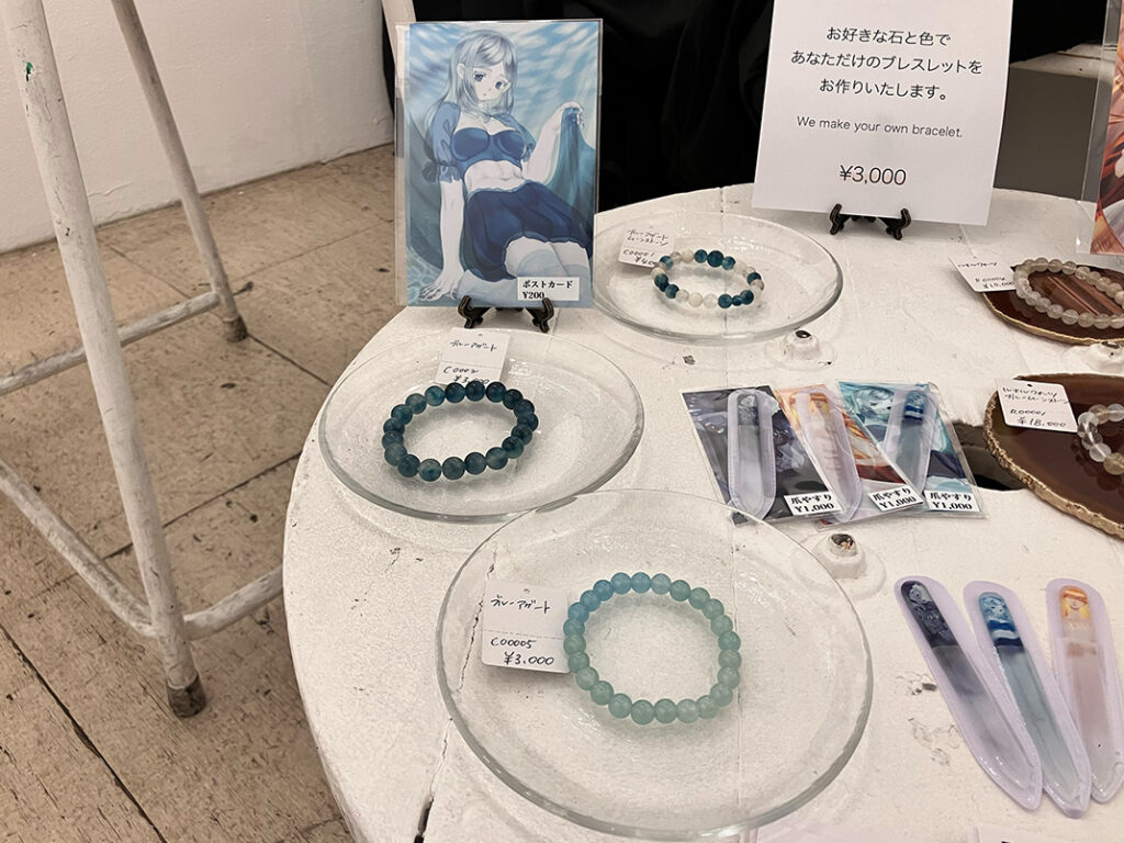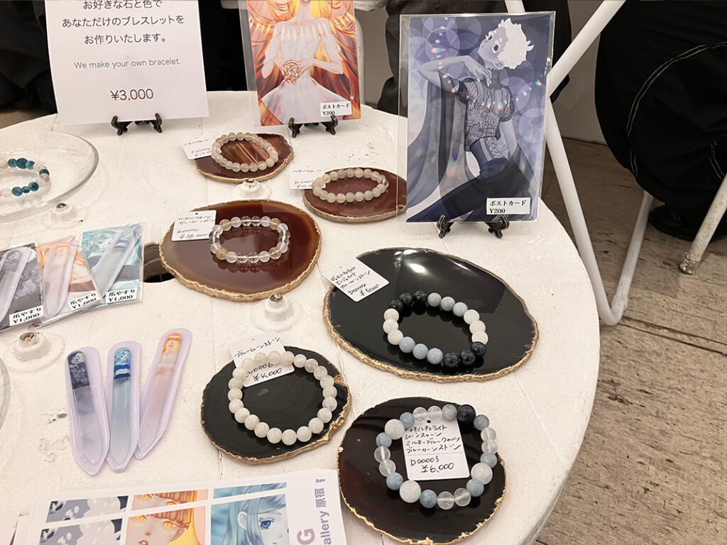 展示では美しいブレスレット作品と、ブレスレットの色に合わせたイメージキャラクターのイラストが展示されています✨