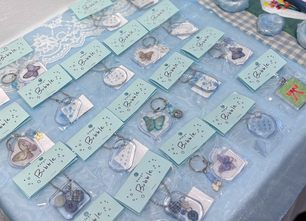 キーホルダーはまるで泡を閉じ込めたかのような作りになっており、ビーズやボタン、ガラスを用いて製作されたとのことです🫧