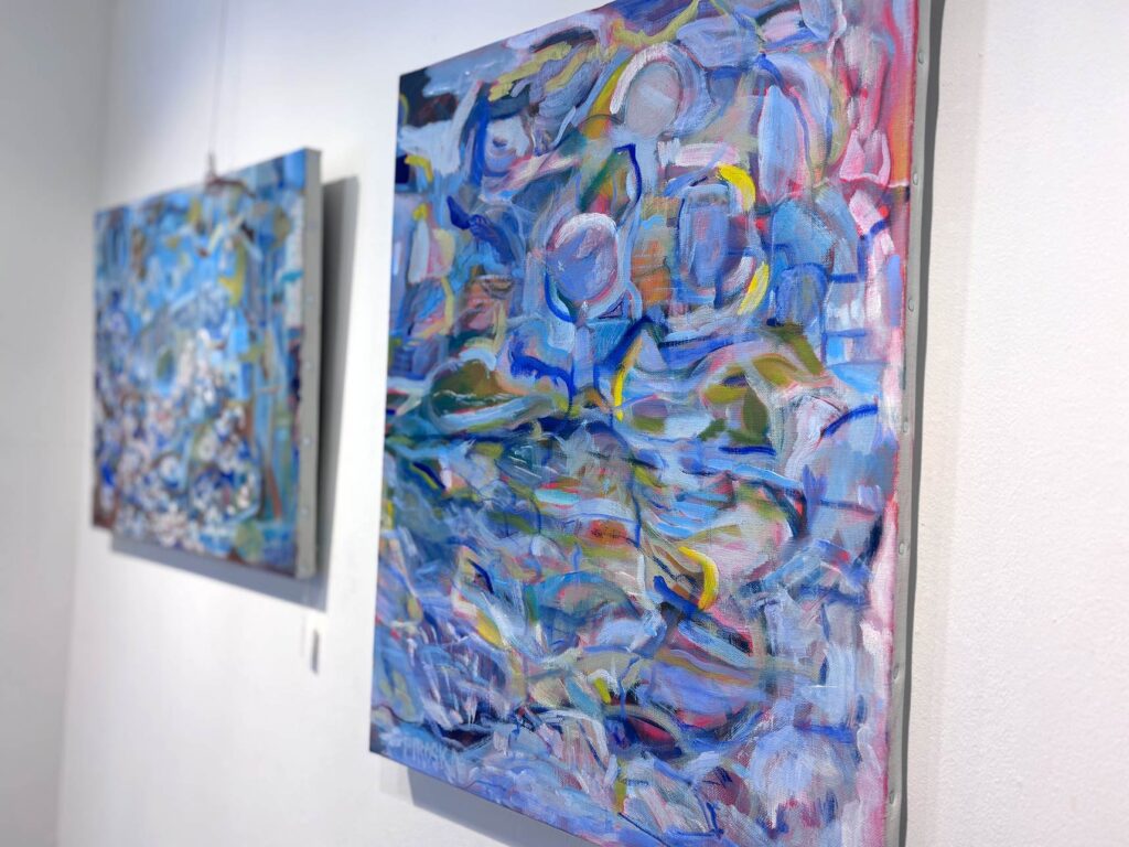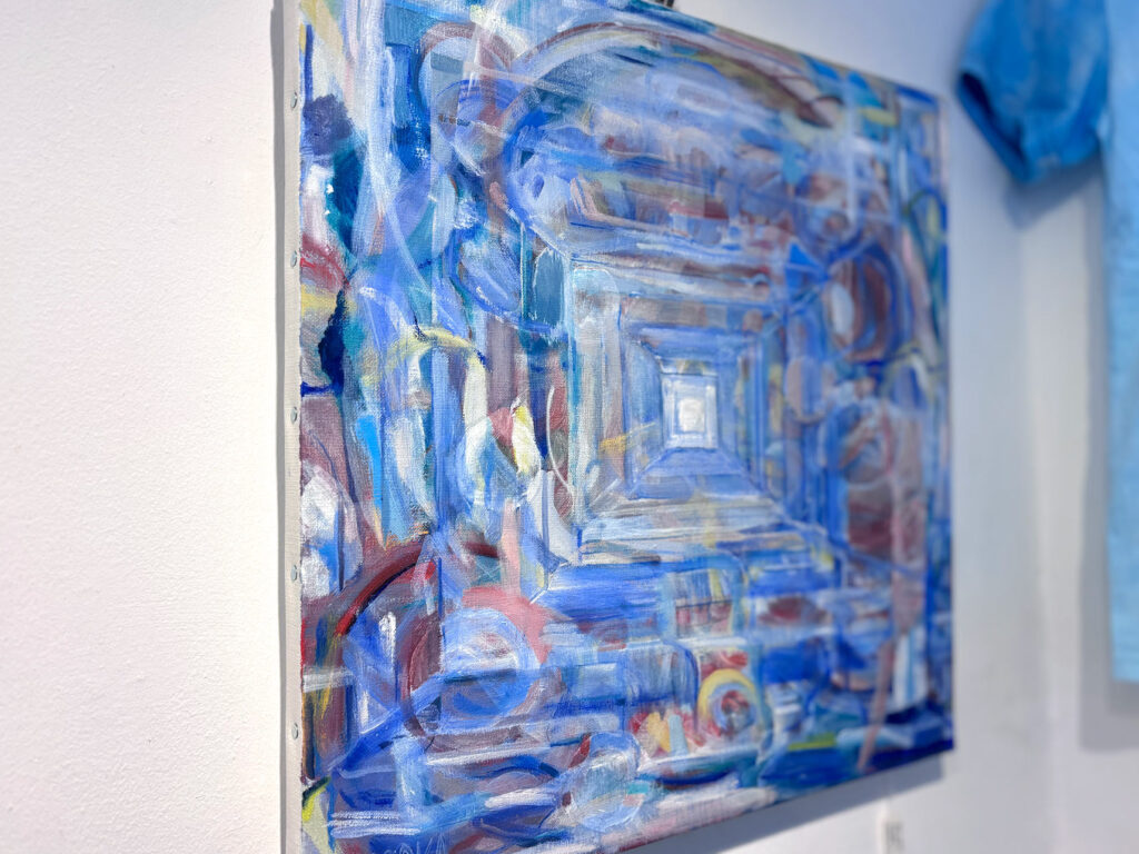 迫力のあるキャンバスの中には青を基調に黄色やピンクなどのお色も混ぜ込まれ、幻想的な抽象画となっております。
