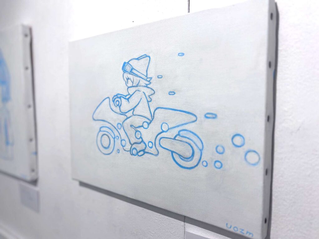 バイクに乗って走る作品はシャボン玉のような丸がバイクのスピード感を表現し、より爽やかに感じさせます。