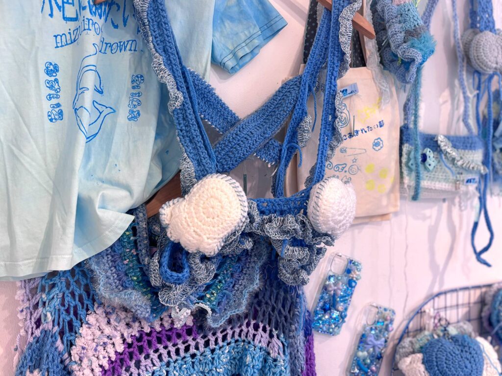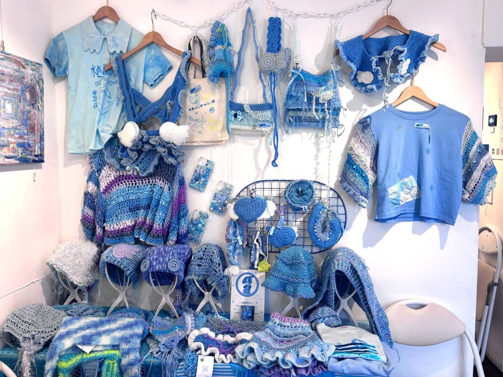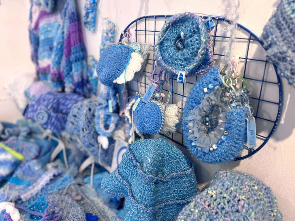 青、水色の毛糸をふんだんに使った編み物作品を販売いただいております。