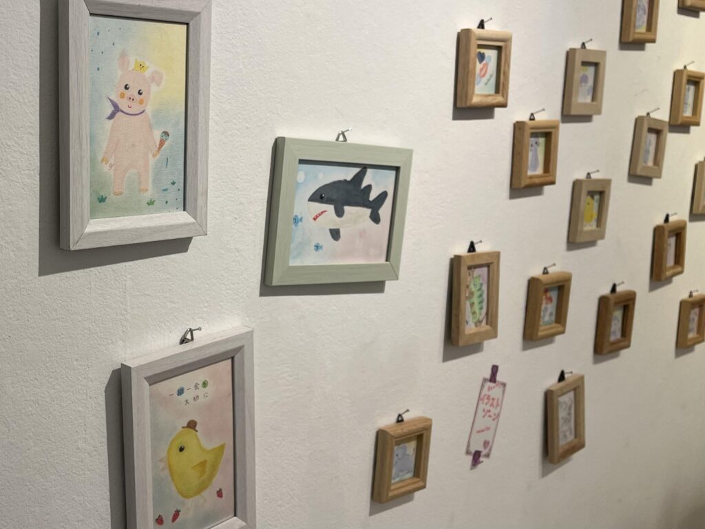 こぶたやひよこ、ねこなどかわいい動物たちの原画がこちらの壁に展示されています!