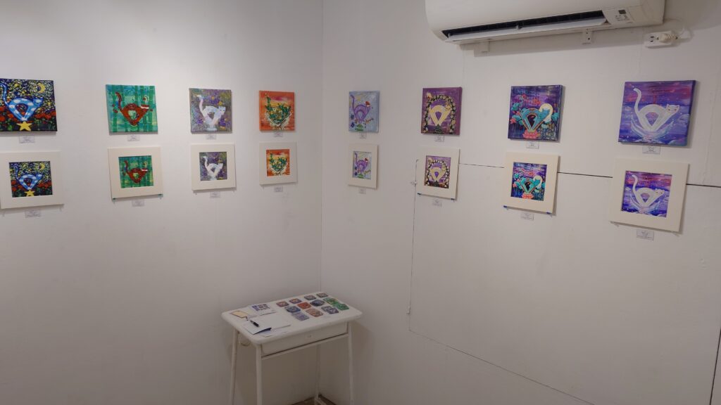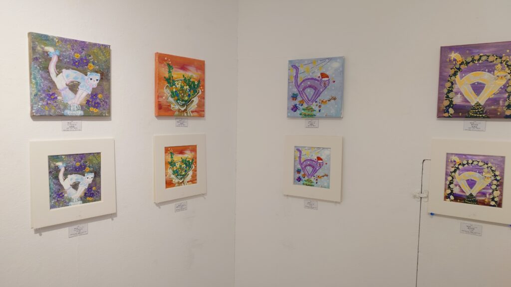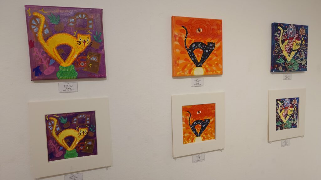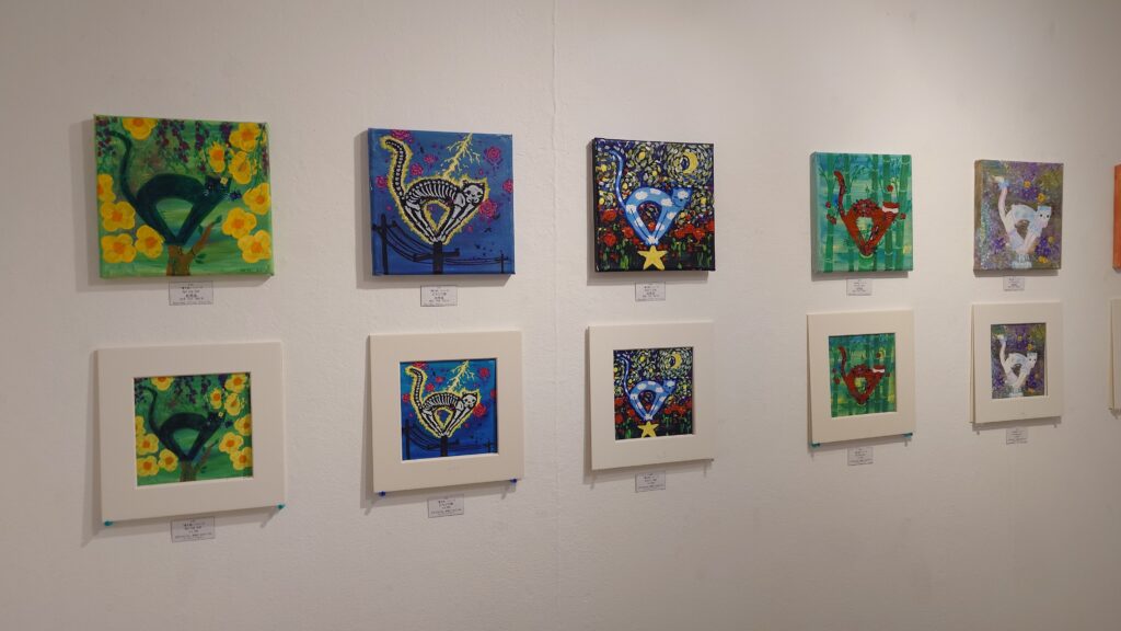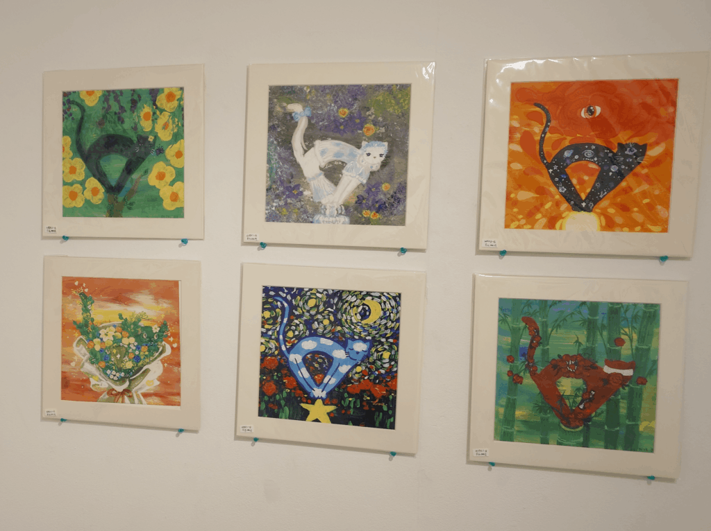 展示スペースには、様々なモチーフで描かれたカラフルな可愛い猫ちゃんのイラストがたくさん展示されています!