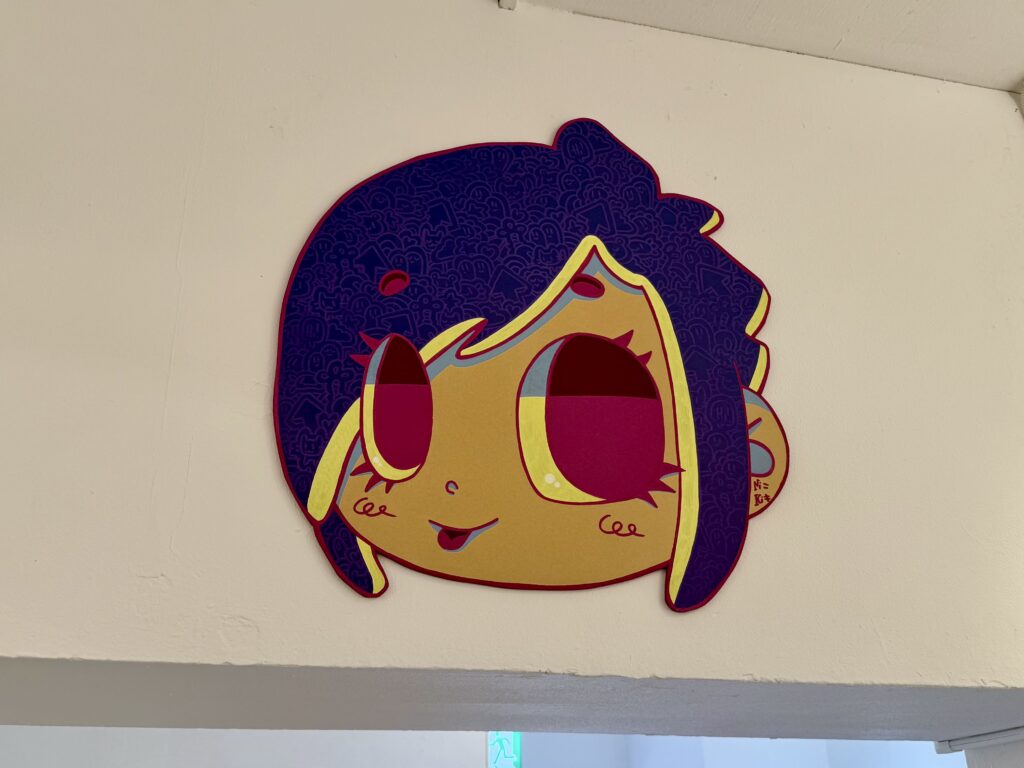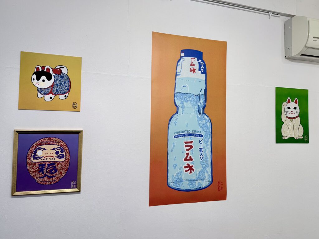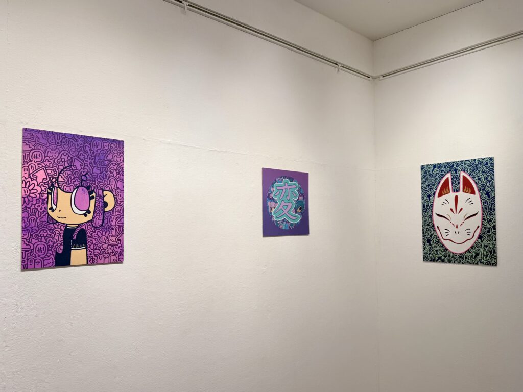 作品に日本語が描かれていたり、狐面や招き猫、ダルマなど…日本を感じるモチーフが作品にたくさん取り込まれています🇯🇵