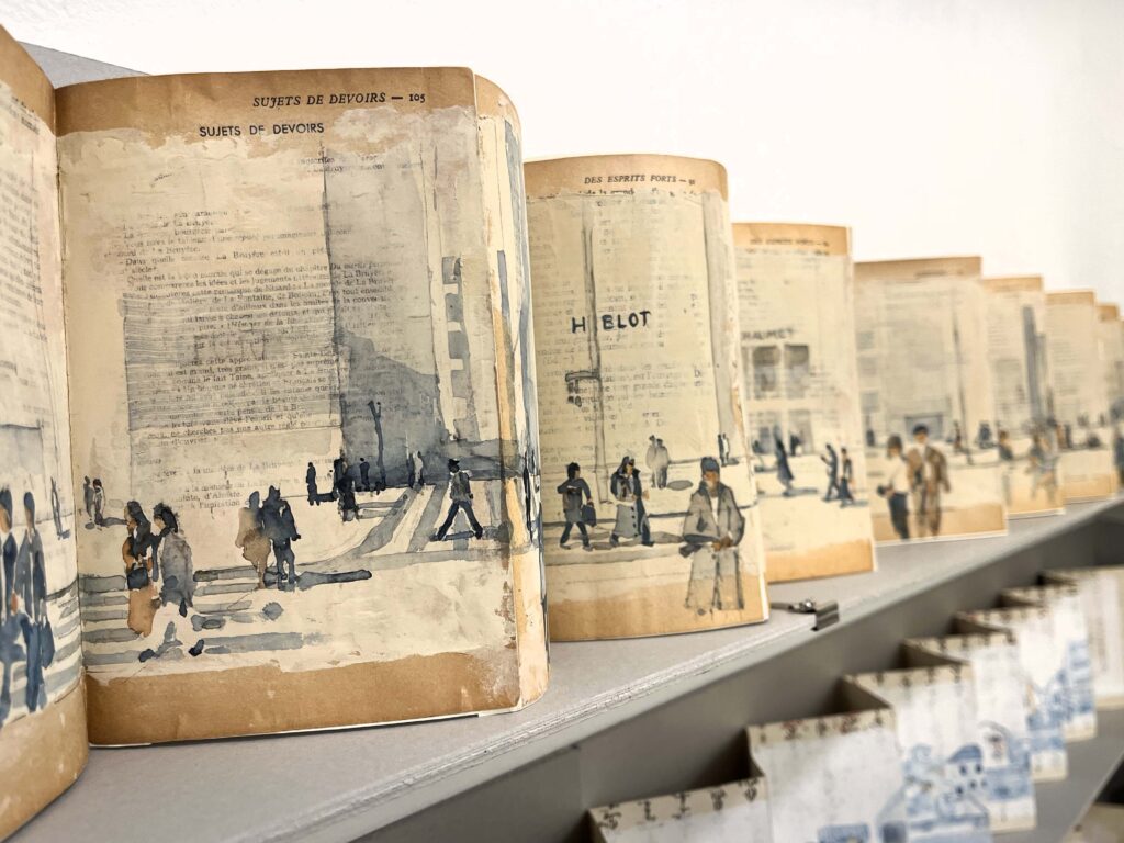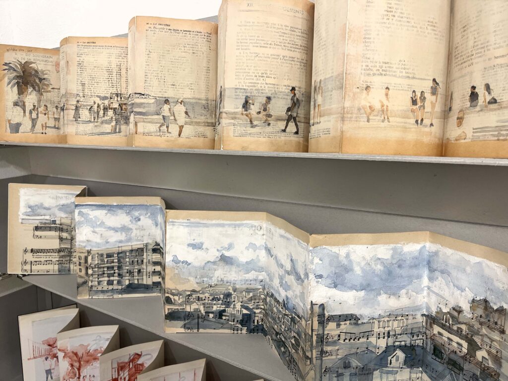 古書のページの上に水彩絵の具で旅の物語を描かれた作品です。