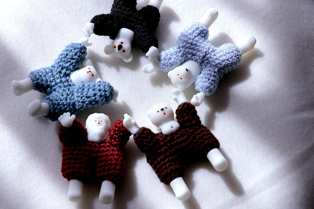 内容物: ぬいぐるみのキーリング(ちいさなアクリルパーツつき) 3Dプリントの頭と布の体を持つ、ちょっと変わった珍獣たちの展示。 チャイナヘッドドールを思わせる懐かしさと、新しい素材感が同居する人形です。