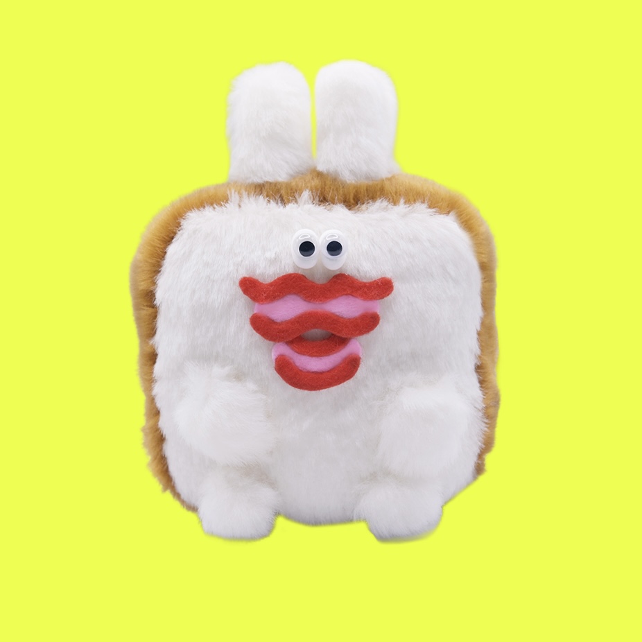 【作品について】 「朝ごはん」をテーマに、食パン、目玉焼きなどをモチーフにしたぬいぐるみを制作しています。朝のやる気のなさと、作者が好きな「ウサギ」の要素を組み合わせているのが特徴です。