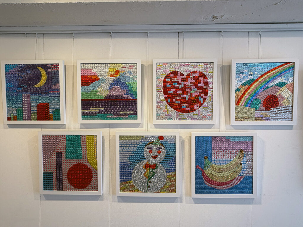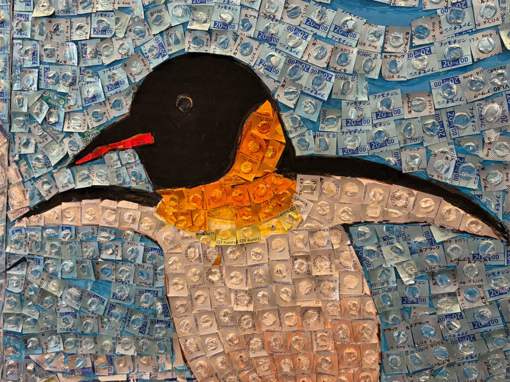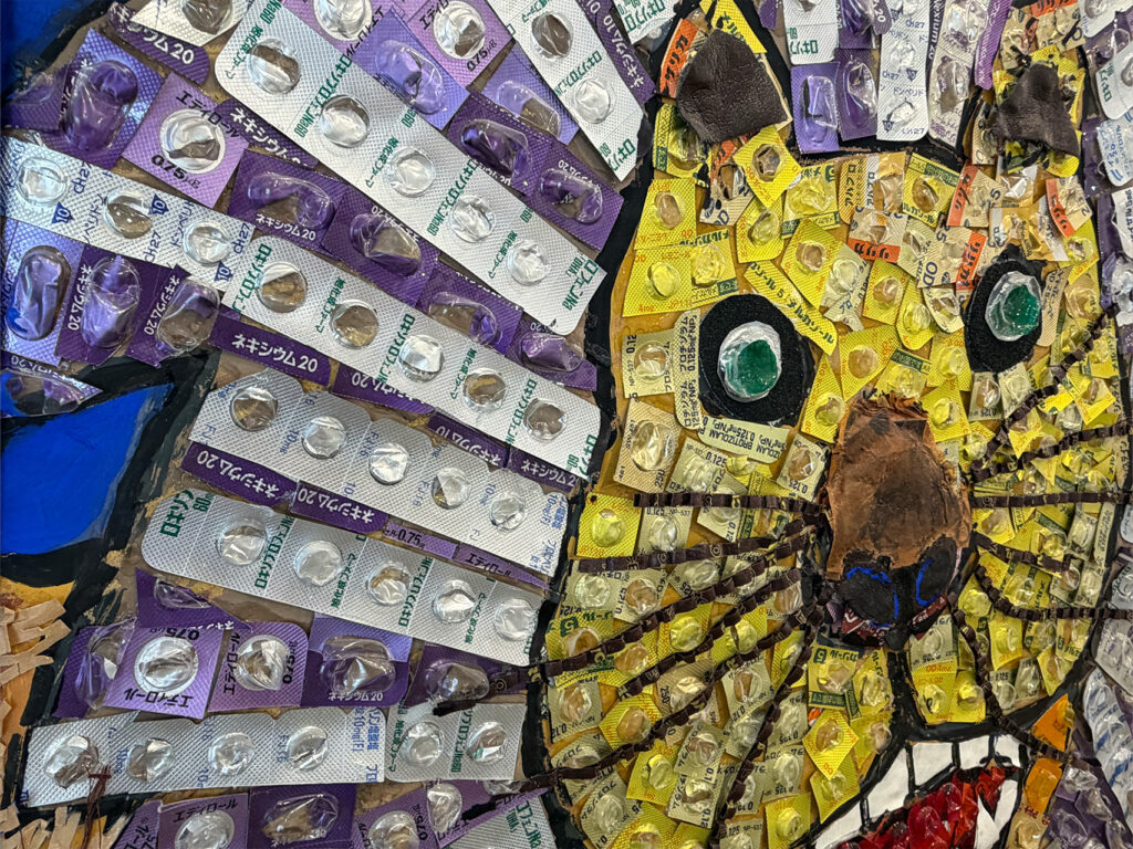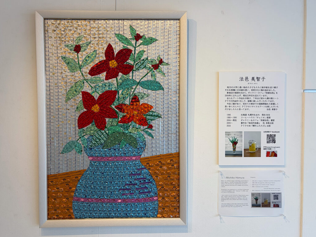 法邑さんご自身がご病気だった時に、ご自身の飲み終わった薬のPTP包装を見てキラキラと輝く素敵な色合いだと気がつき、PTP包装を使用した作品の制作を始めたそうです。