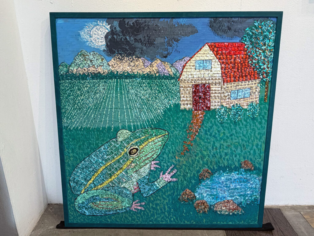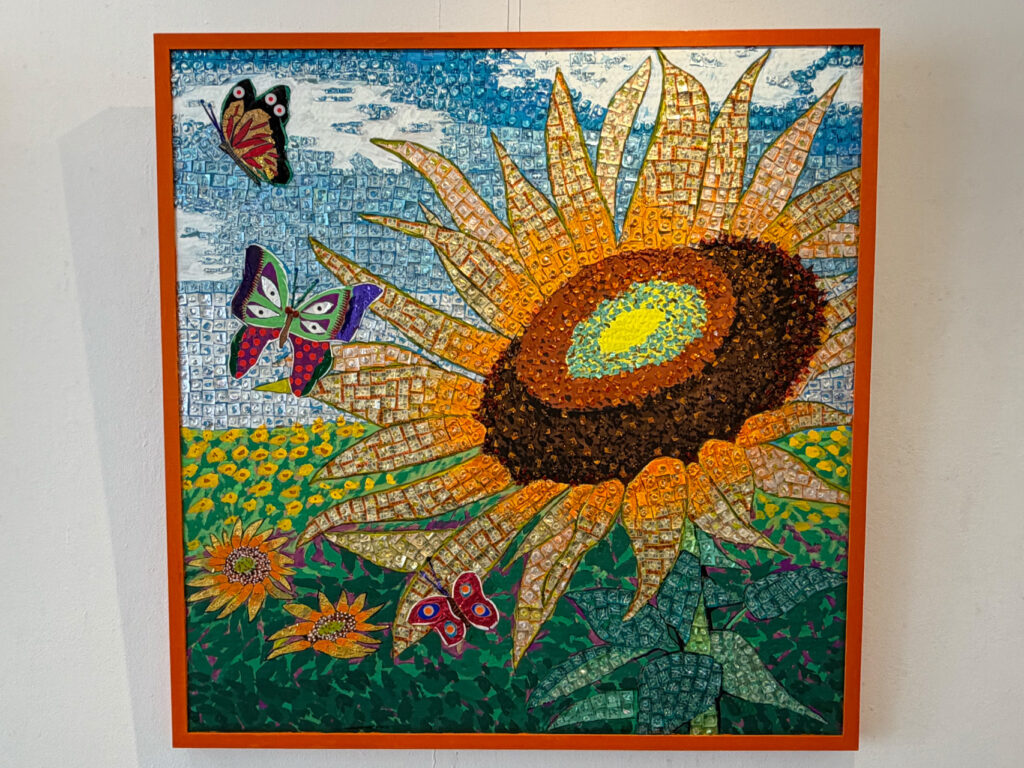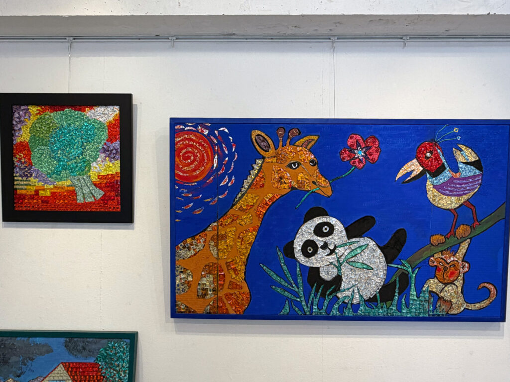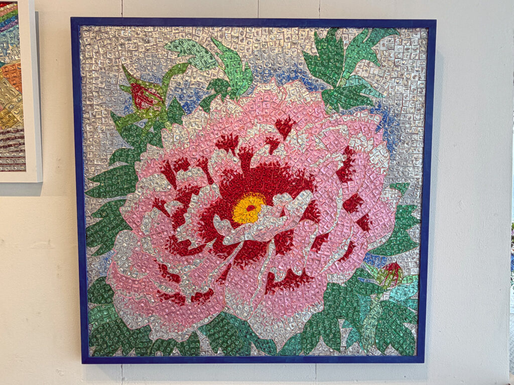 法邑さんご自身がご病気だった時に、ご自身の飲み終わった薬のPTP包装を見てキラキラと輝く素敵な色合いだと気がつき、PTP包装を使用した作品の制作を始めたそうです。