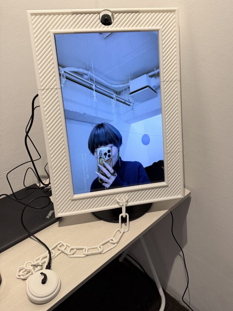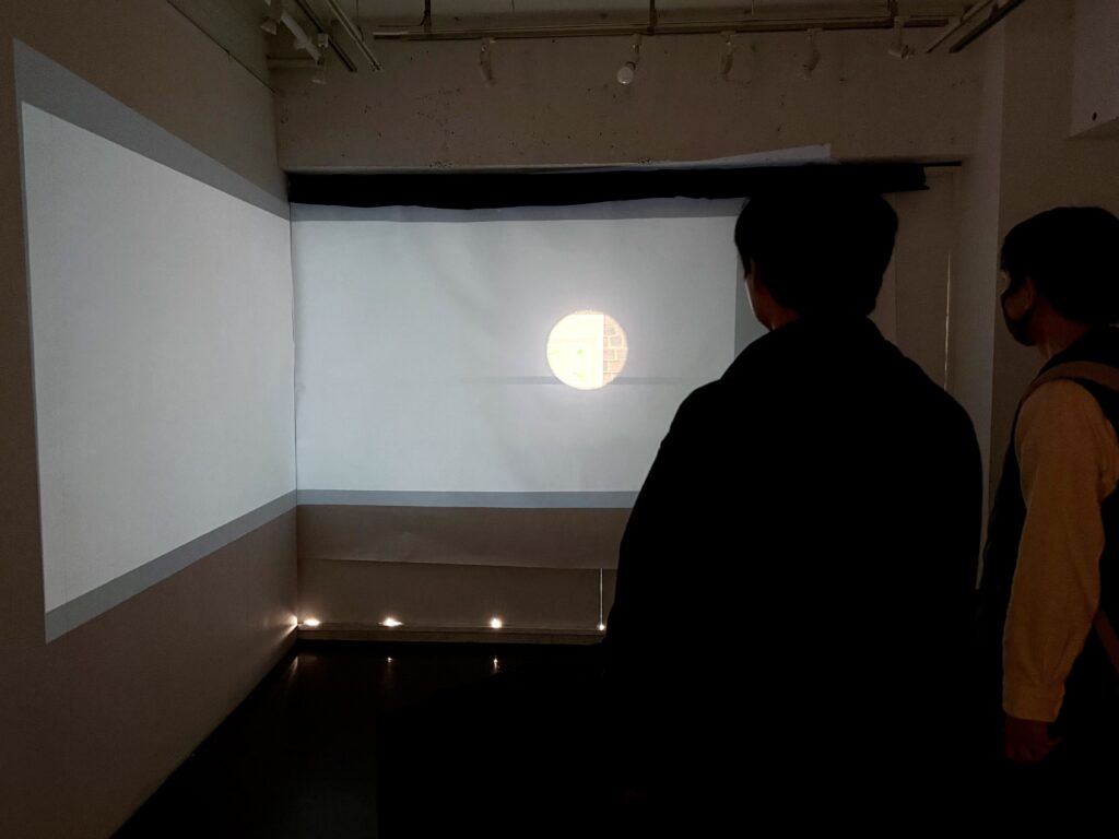 1つ目は、展示空間が鏡のように映し出された映像作品と、針が逆方向に曲がった不思議な時計の作品🕰️