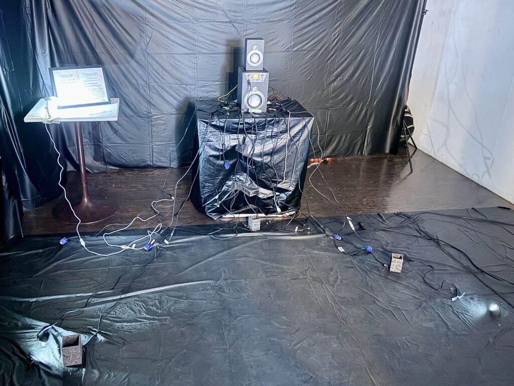 お部屋の中心に一定のリズムで心音が流れているスピーカーが置いてあり、足元にもたくさんのセンサーやマイクが👀