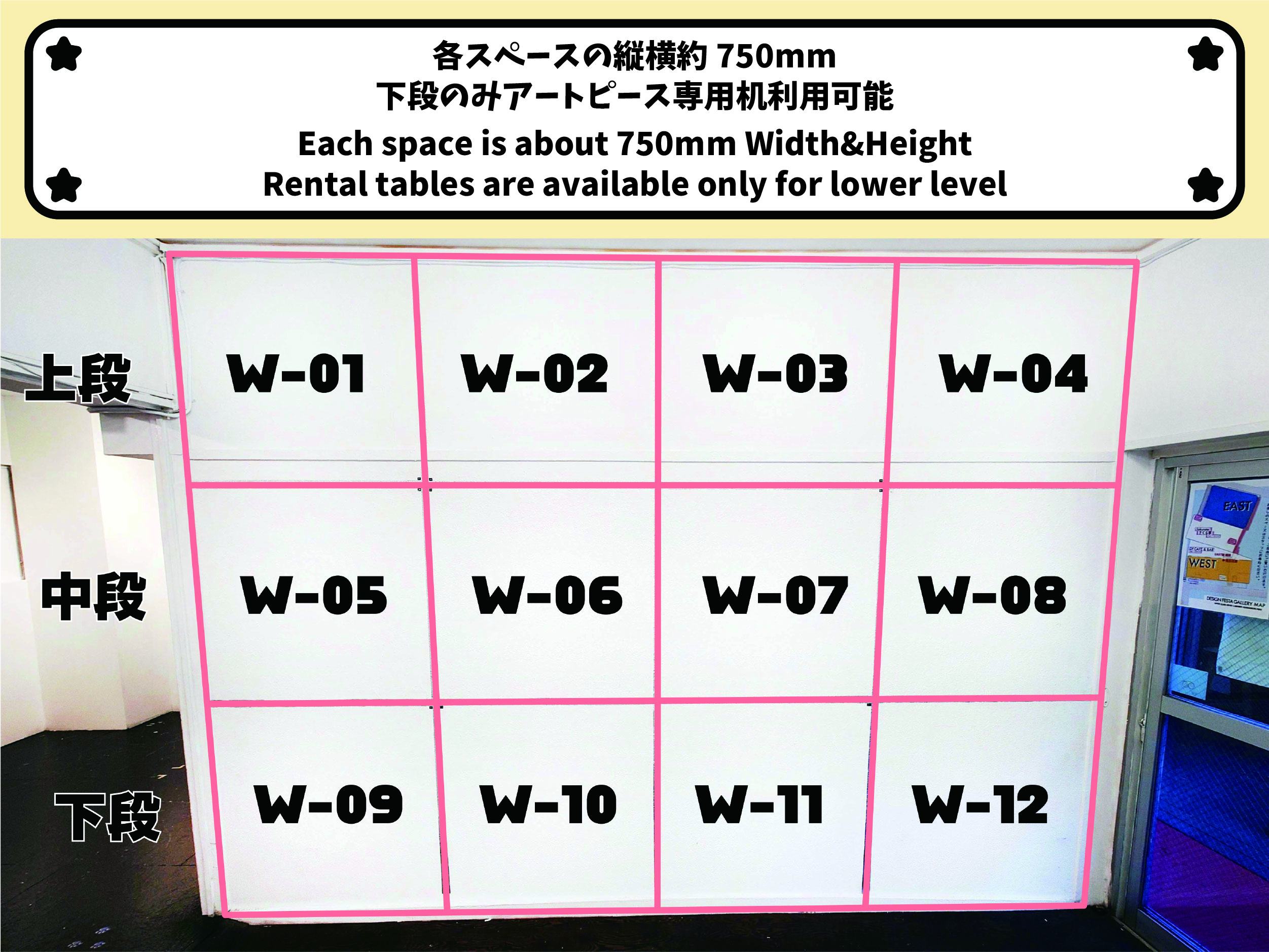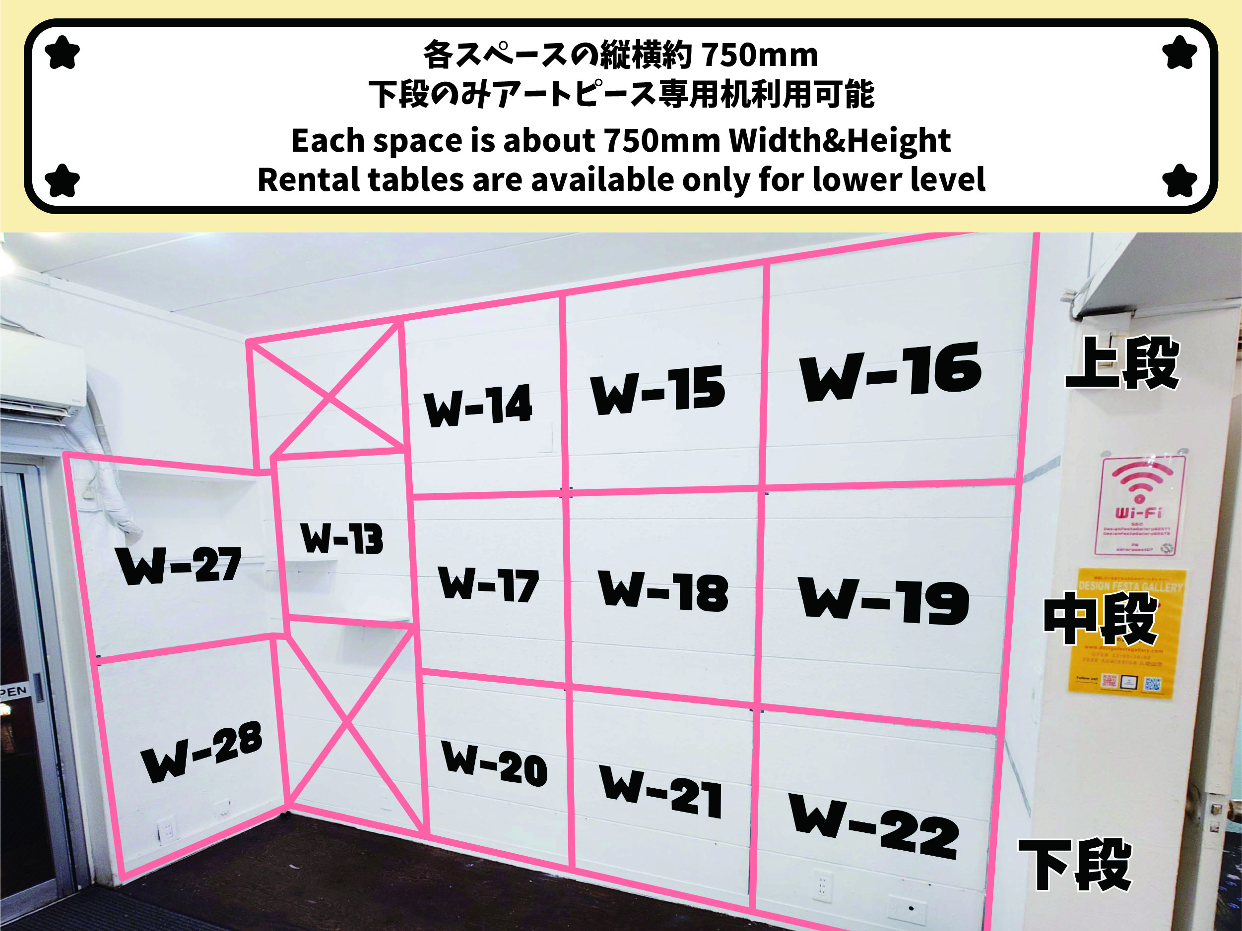 約750mm×750mmの壁面のスペース。複数組み合わせてもご利用頂けます。作品販売も可能です。販売についてはこちら。