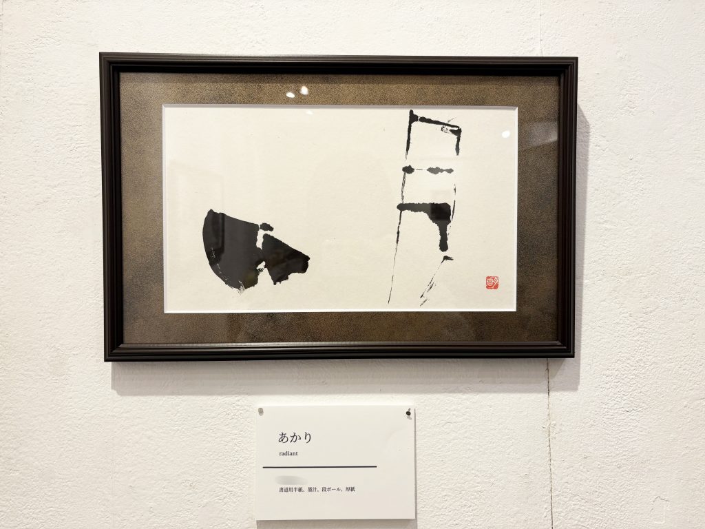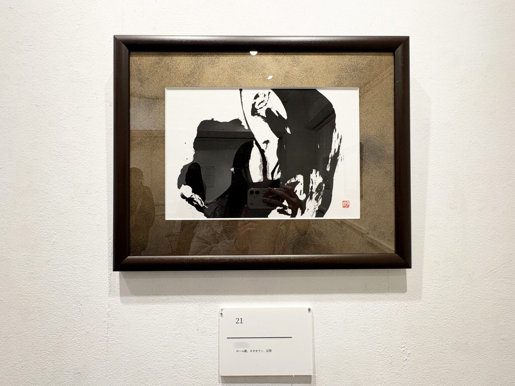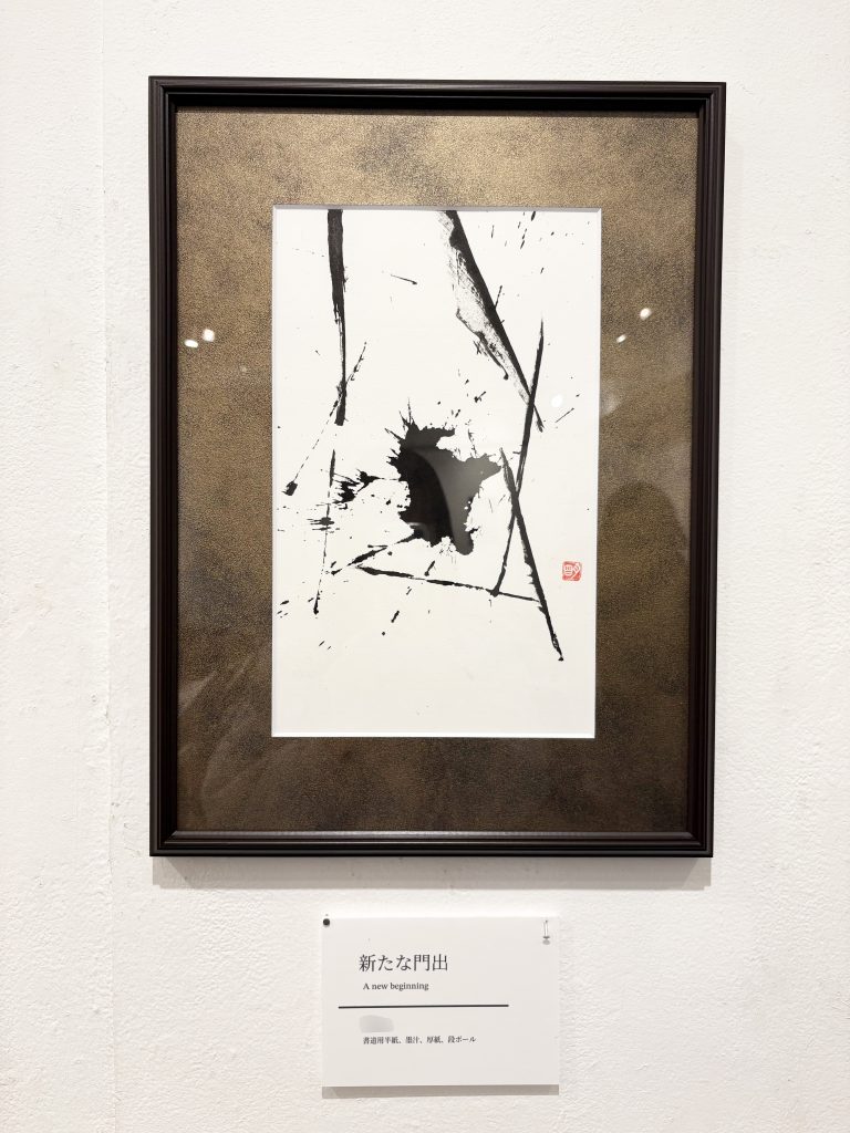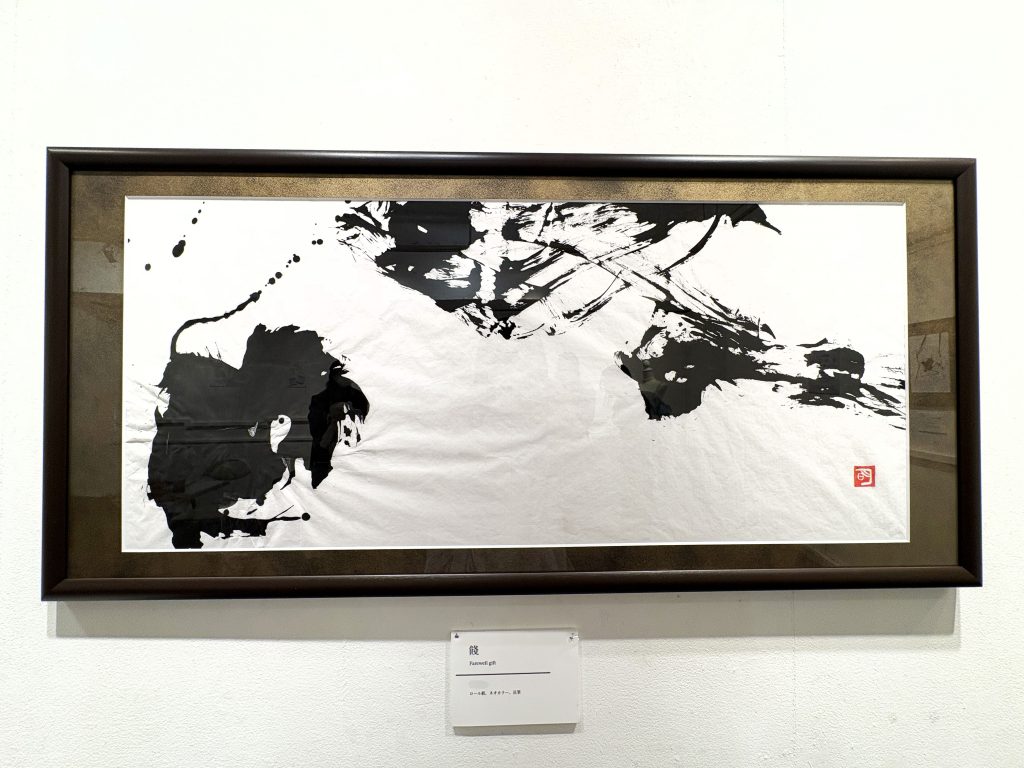 前衛書道の作品。前衛書道の特徴は必読性の無さ、表現の幅の広さが挙げられ、本展示の作品の構成要素は「線」「面」「白(余白)」「黒」の4つを組み合わされています。